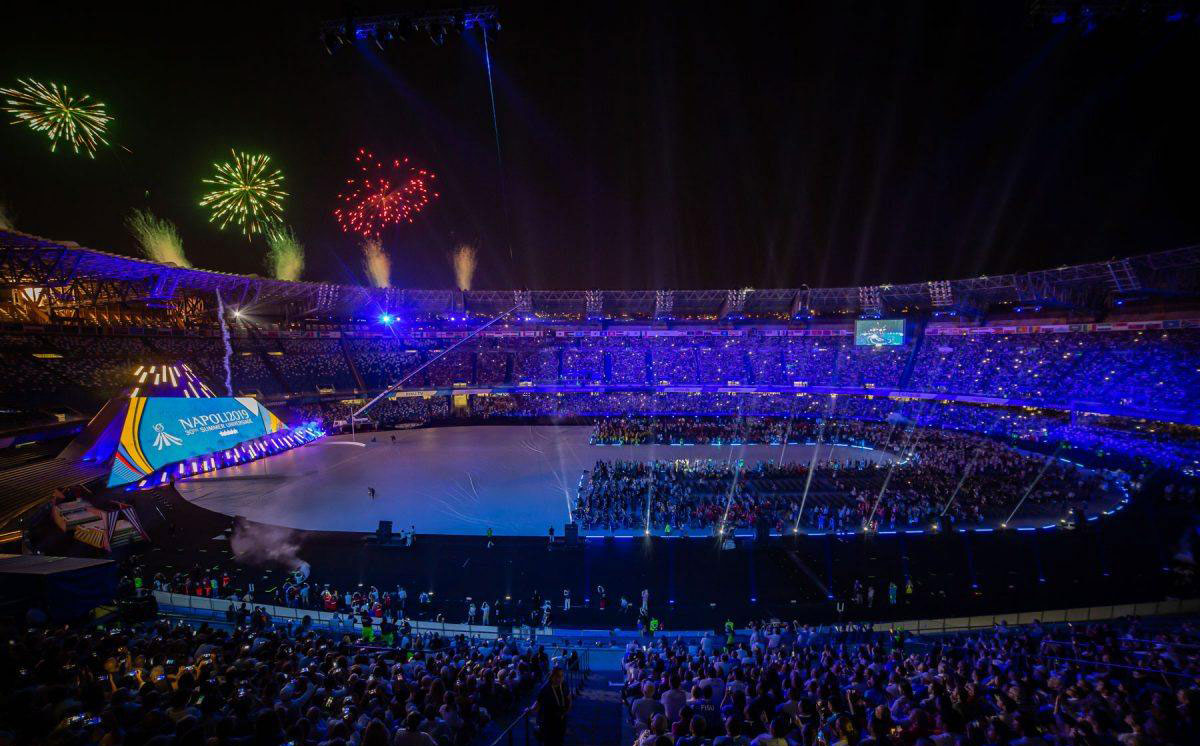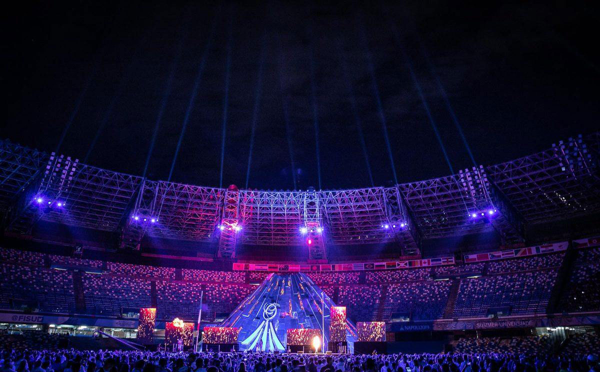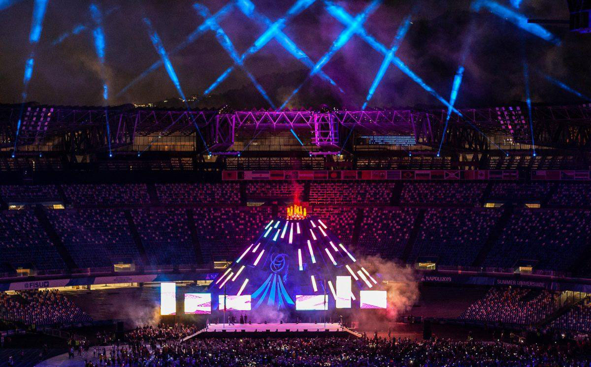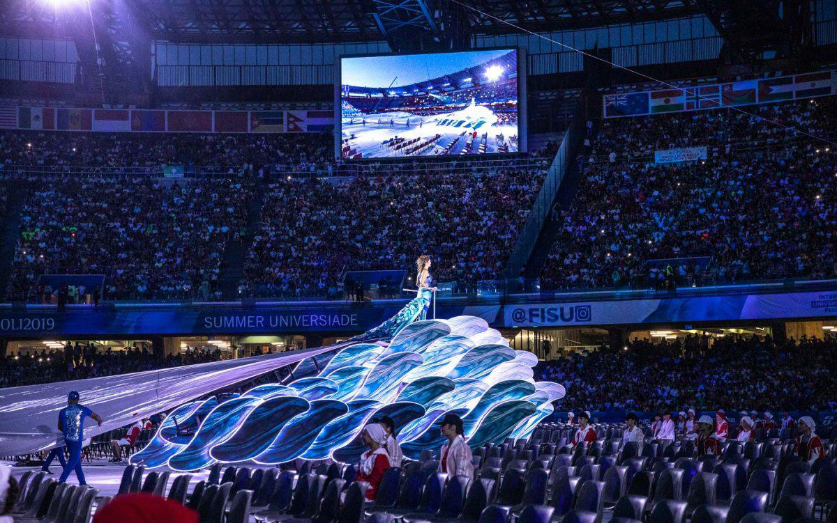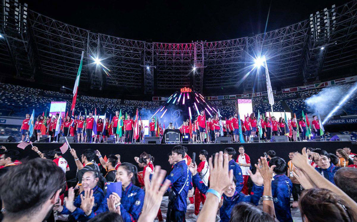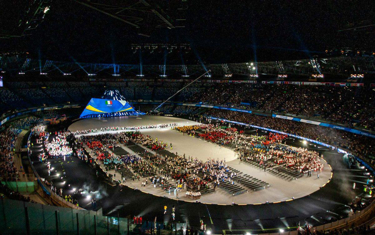 在數(shù)萬名觀眾和運動員的見證下,第30屆世界大學(xué)生夏季運動會在意大利那不勒斯正式開始了。開幕式現(xiàn)場的火炬點燃儀式由那不勒斯足球隊前鋒因西涅將燃燒著的火球踢向做成火山形象的“山頂”,并點燃主火炬。盲人男高音歌唱家安德烈·波切利更是以一首《今夜無人入睡》將開幕式引向高潮。