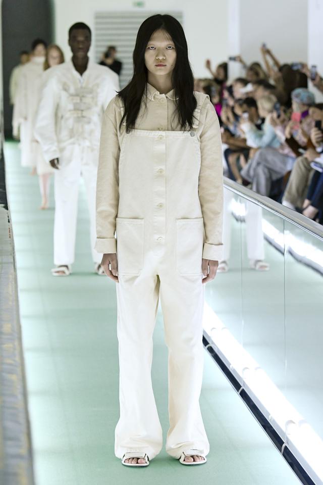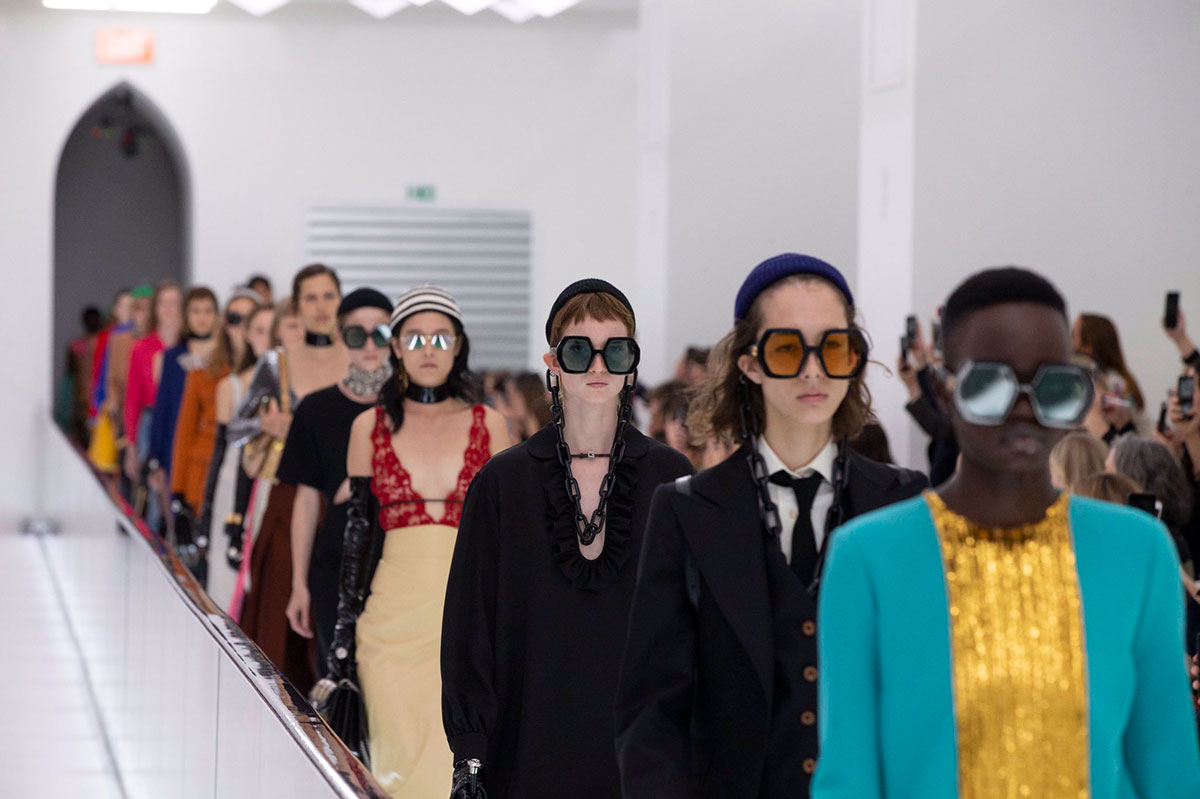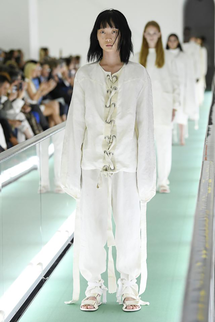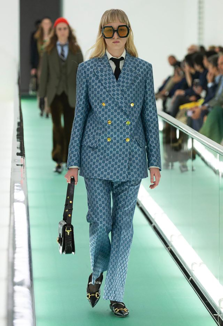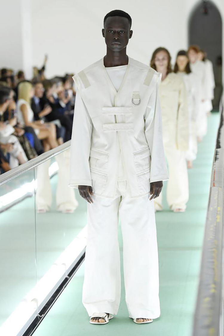 GUCCI? SS20秀場(chǎng),選在了自家的米蘭GUCCI?HUB,簡(jiǎn)潔空間,白色空間,傳送帶秀臺(tái),實(shí)際秀場(chǎng)中模特有的需要走秀,有的靠傳送帶傳輸。而創(chuàng)意總監(jiān)Alessandro Michele也在Gucci 2020春夏系列設(shè)計(jì)中,加入了一部分很不Gucci的設(shè)計(jì),一系列純白色的服裝被男女模特展示,這部分服裝更貼近最原始的色彩,像是未經(jīng)染色的白坯布,模特們則像被傳送帶傳送出來,異?!八腊濉?。