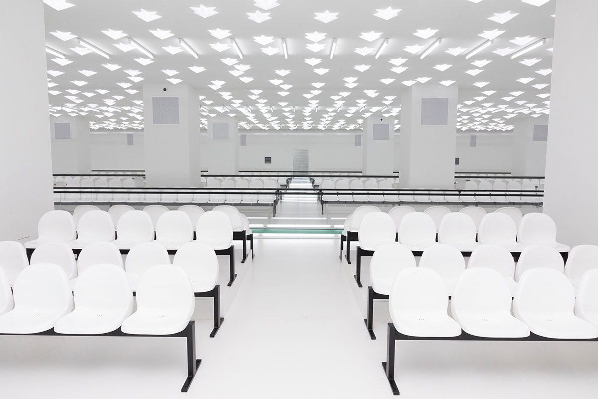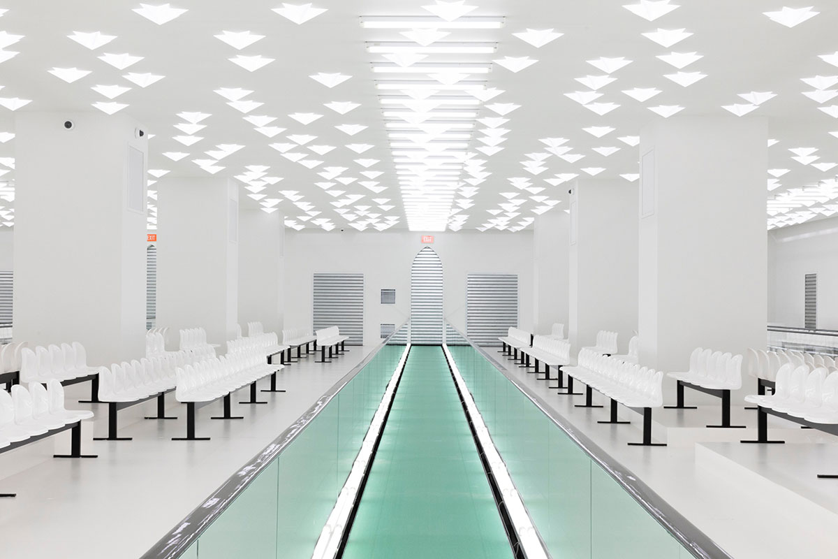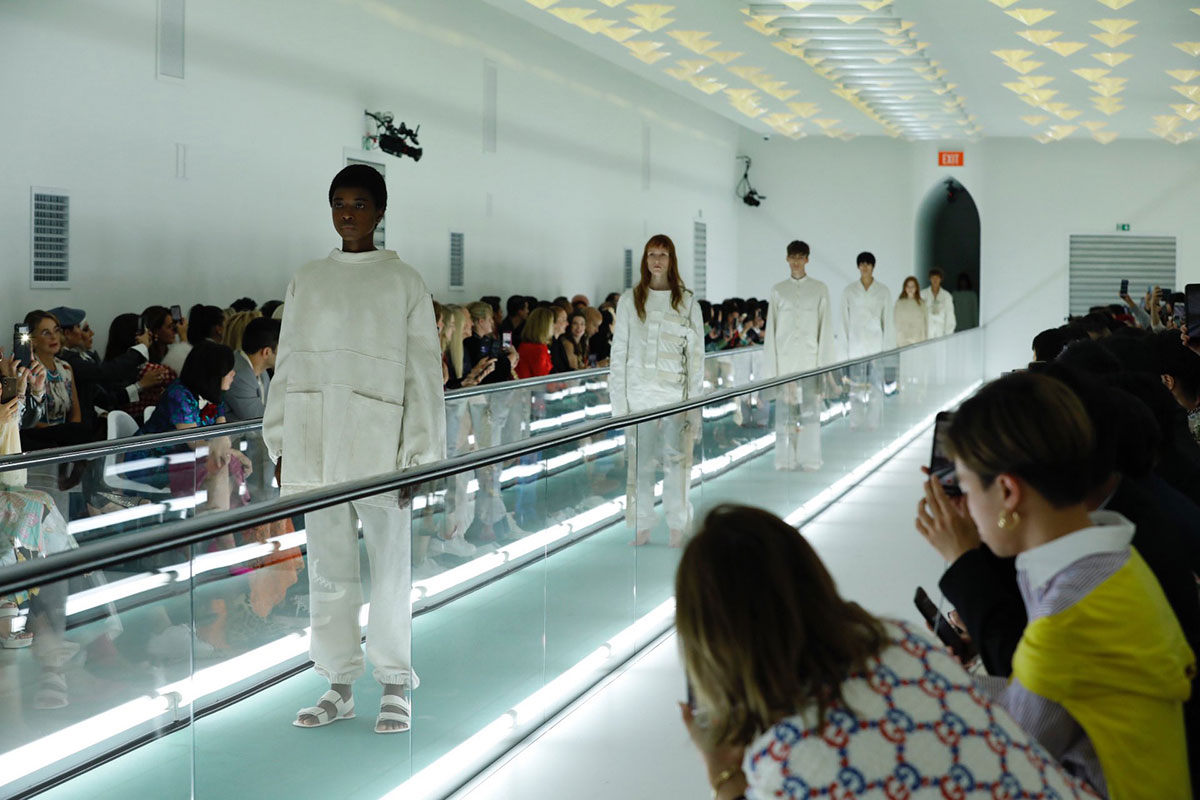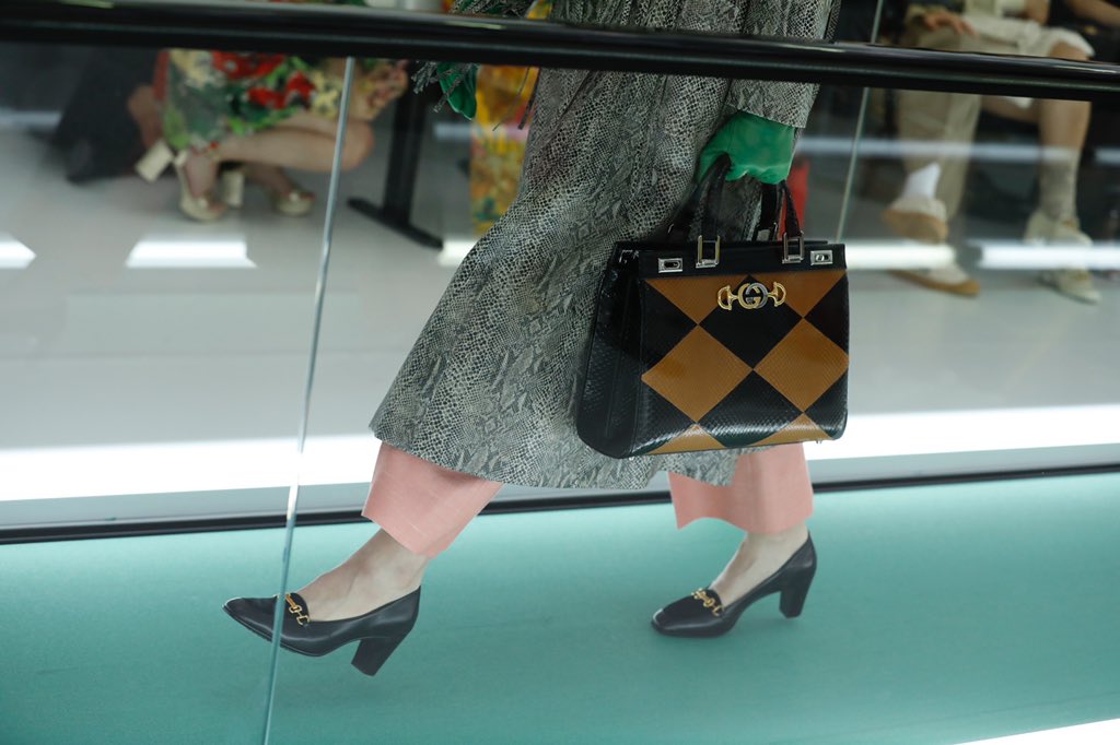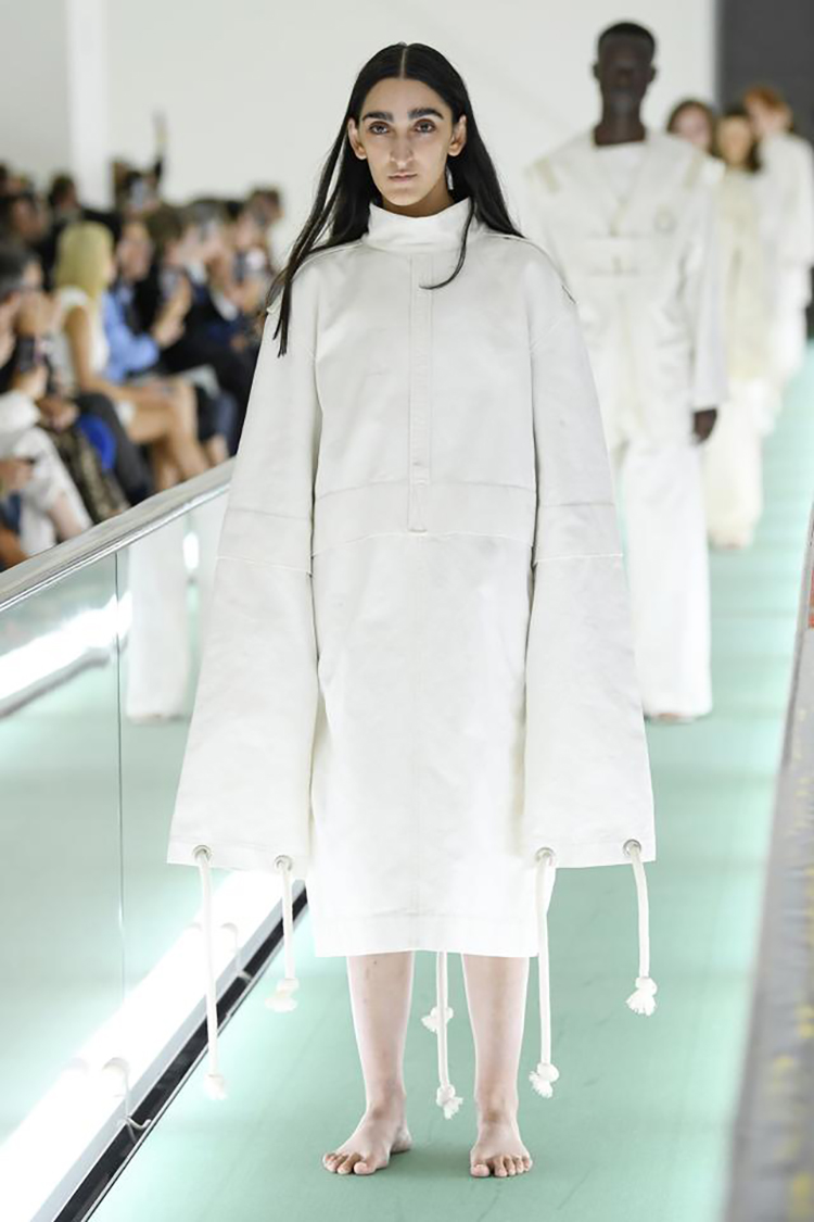 GUCCI? SS20秀場(chǎng),選在了自家的米蘭GUCCI?HUB,簡(jiǎn)潔空間,白色空間,傳送帶秀臺(tái),實(shí)際秀場(chǎng)中模特有的需要走秀,有的靠傳送帶傳輸。而創(chuàng)意總監(jiān)Alessandro Michele也在Gucci 2020春夏系列設(shè)計(jì)中,加入了一部分很不Gucci的設(shè)計(jì),一系列純白色的服裝被男女模特展示,這部分服裝更貼近最原始的色彩,像是未經(jīng)染色的白坯布,模特們則像被傳送帶傳送出來,異?!八腊濉?。