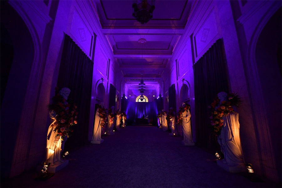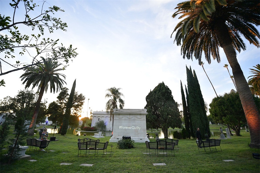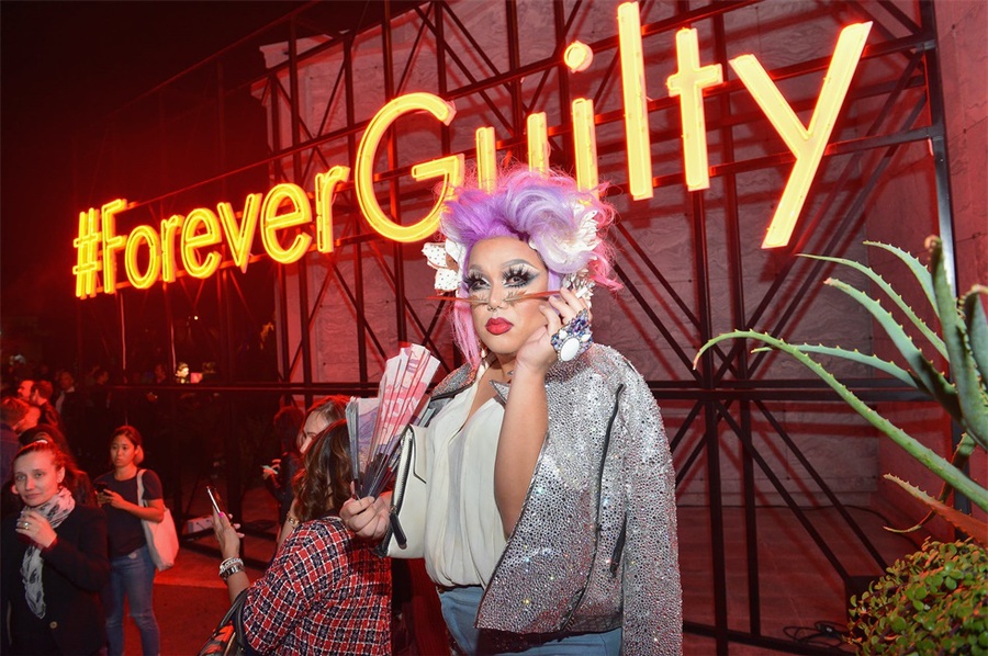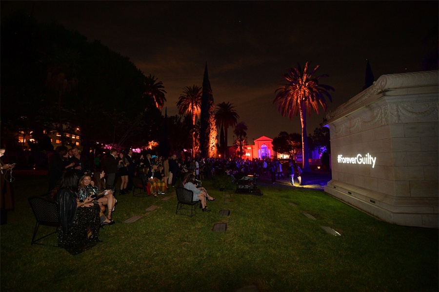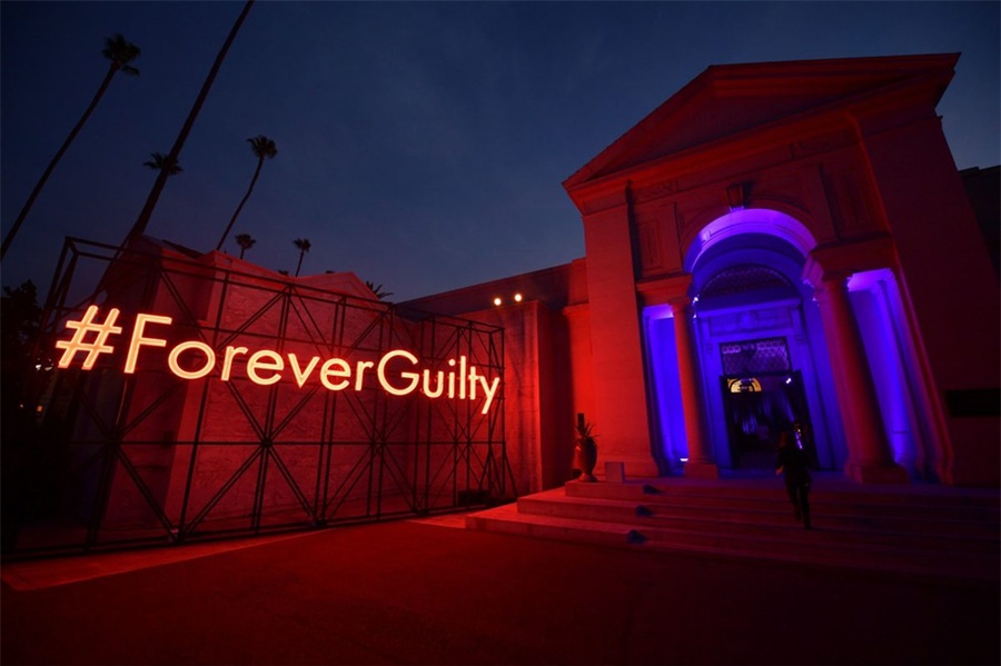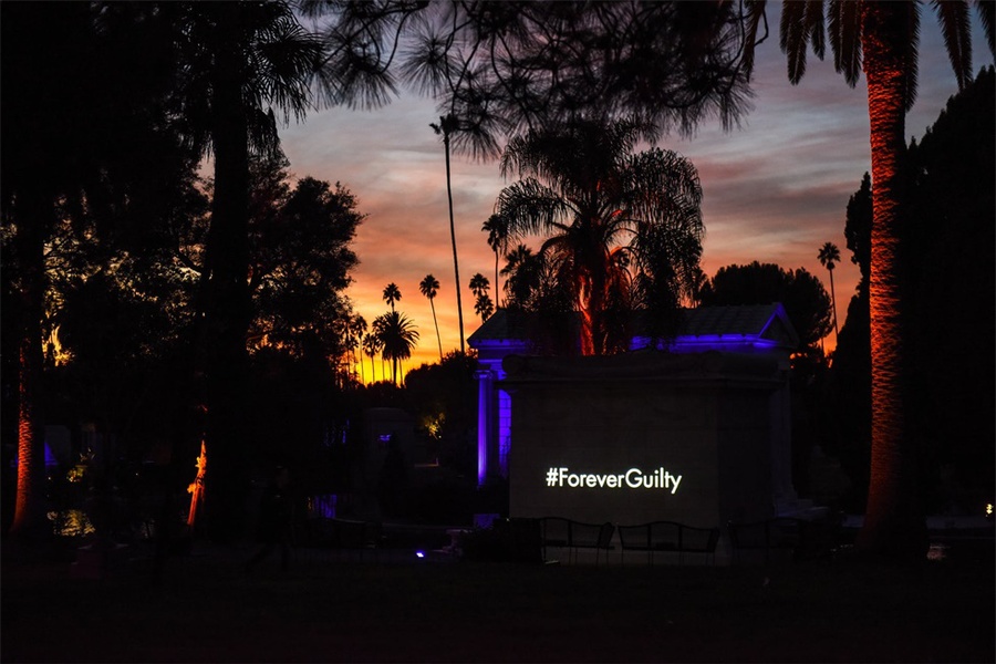 該派對(duì)在約翰尼·拉蒙(Johnny Ramone)的墳?zāi)垢浇暮萌R塢大教堂陵墓內(nèi)及其周圍舉行,服務(wù)員在陵墓外面的銀托盤上分發(fā)了香檳,伏特加酒和三明治,上面放著一個(gè)超大號(hào)的霓虹燈#ForeverGuilty霓虹燈作為照相背景。在陵墓內(nèi)部,展示了新香水,和DJ伴奏的跳舞區(qū)。