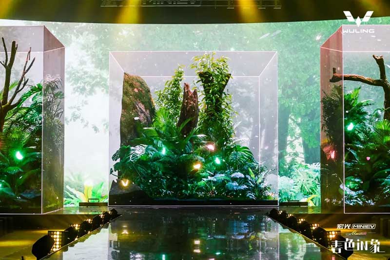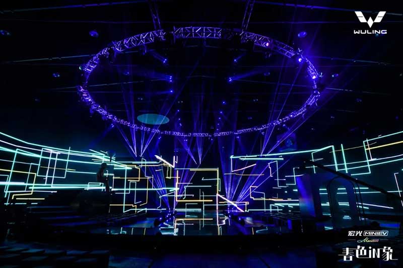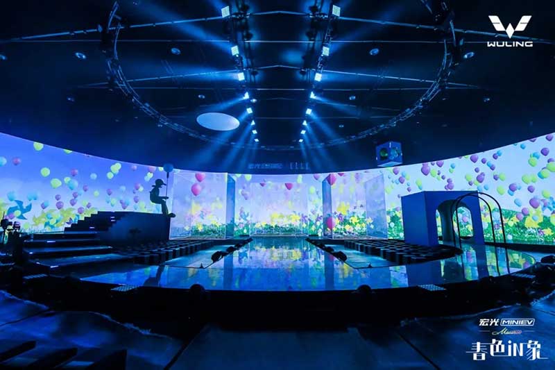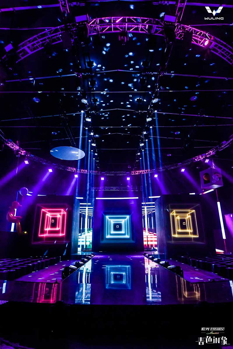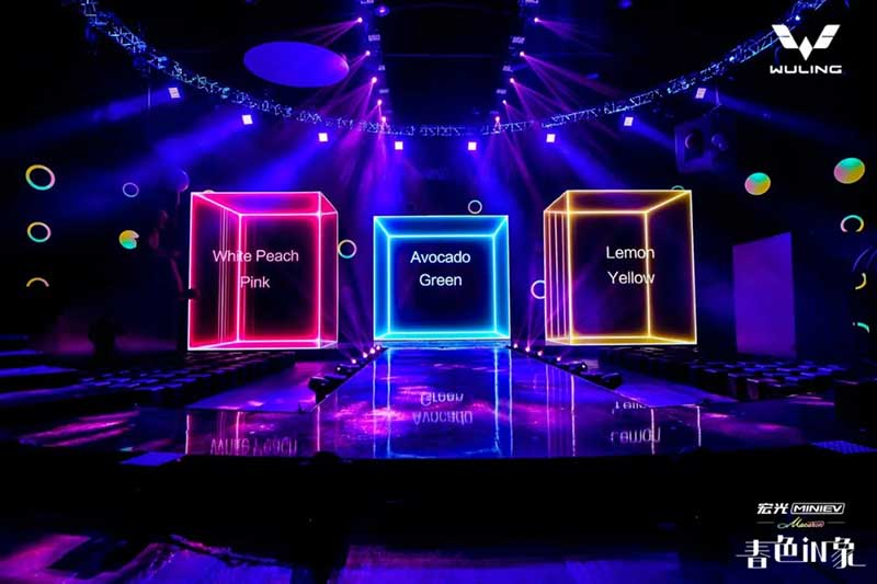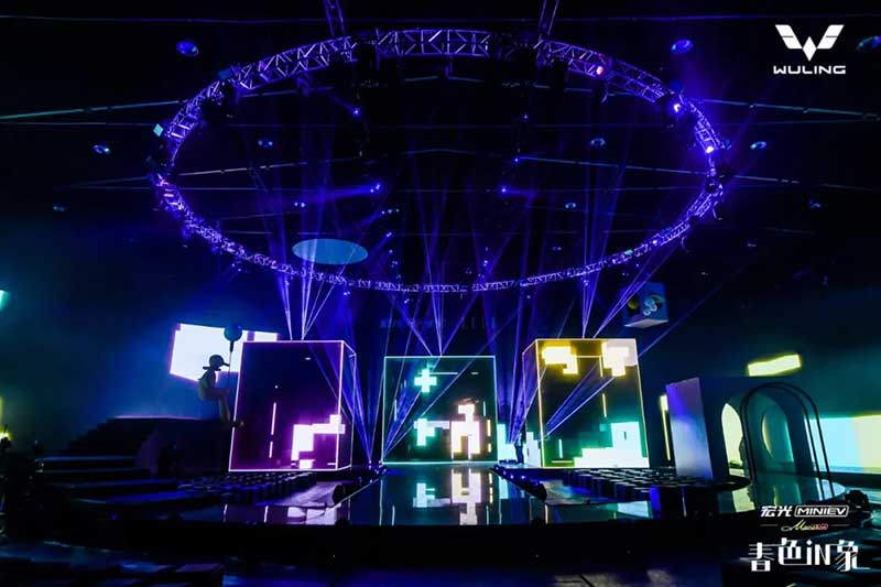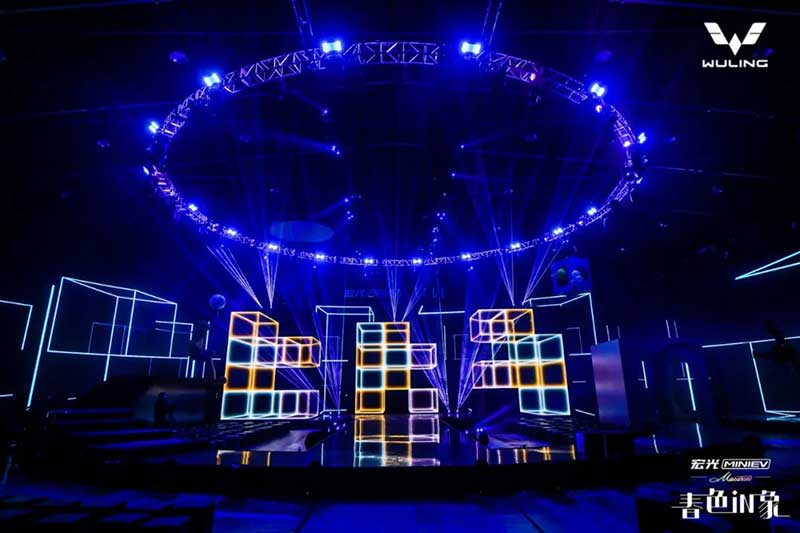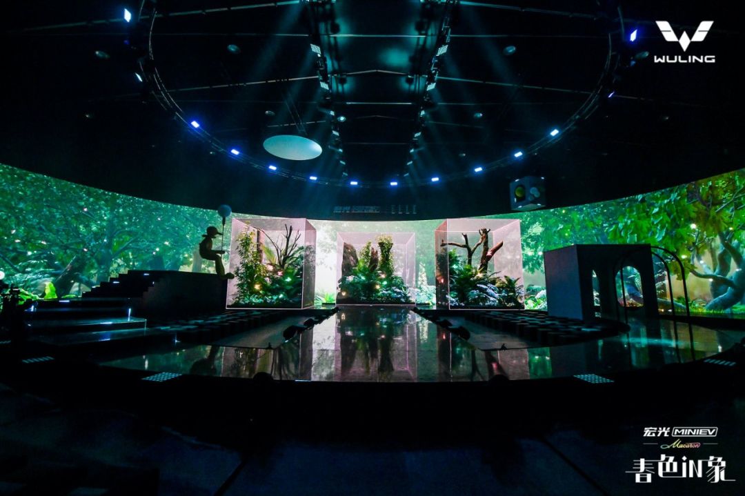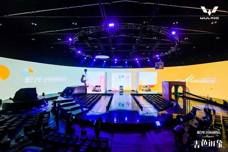 內(nèi)場的設(shè)計是這次發(fā)布會分享的重頭戲,雖然在發(fā)布環(huán)節(jié)上沒有特別多的驚喜設(shè)計,可撐起這場發(fā)布會顏值與記憶點的,是舞美與視覺。這就回到Event圈的專業(yè)本身了,發(fā)布會往往是舞臺設(shè)計最具創(chuàng)新的平臺之一,尤其是車企發(fā)布會,在屏幕及舞美的運用上常常大膽嘗鮮,本次發(fā)布會的重點是推出三款馬卡龍春色EV車型,因此我們看到主創(chuàng)團隊在現(xiàn)場包裹感大屏的前方,又擺放了三個BOX,而在發(fā)布過程中,Speaker講解車型的過程也并未采用大屏鋪開的PPT,而是有的放矢的,把演講內(nèi)容拆分為三欄呈現(xiàn)在三塊BOX屏幕上,開場及串場的演繹環(huán)節(jié),BOX與大屏的內(nèi)容相互配合講故事,并且在內(nèi)容制作上搶盡了風(fēng)頭。由于有走秀與出車的特殊需求,舞臺兩側(cè)T臺口直接延展至舞臺中央,中間的屏幕做了內(nèi)開合門,服務(wù)于出車環(huán)節(jié)。