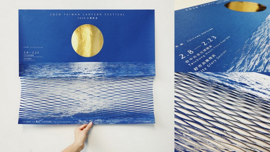 日前率先曝光的主視覺設(shè)計(jì),由設(shè)計(jì)師彭禹瑞和黃瑞怡二人組成的霧室主理,簡潔有力地,以搶眼的視覺概括了整個場館策劃的氛圍。上方澄黃圓滿的日月以燙金加工,海洋則以橫切線條刀模設(shè)計(jì),只要將海報(bào)貼到墻面,用雙手輕輕將海報(bào)下部拉開,就會透出白與藍(lán)交錯、恰似海洋波浪的形態(tài),象征每個人建構(gòu)出的、潛藏于心里的海。