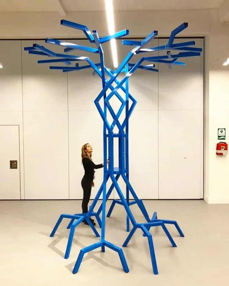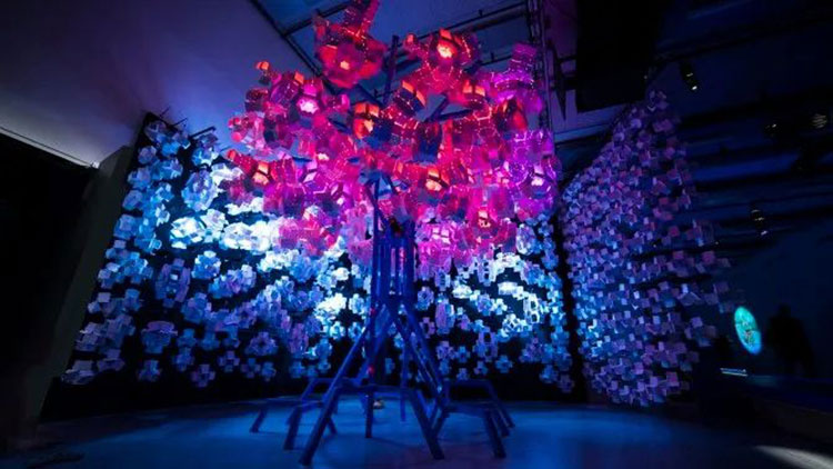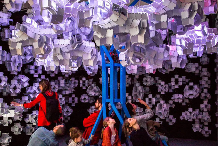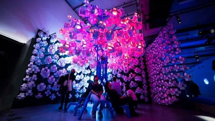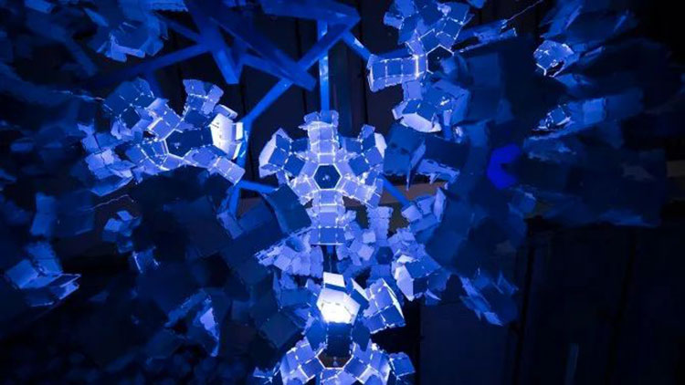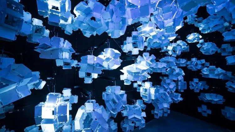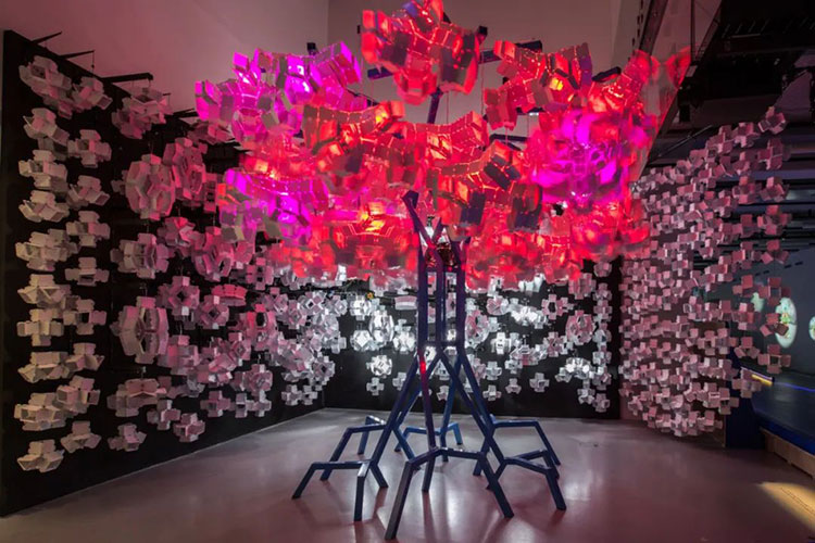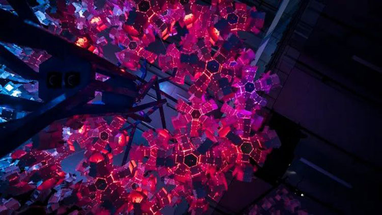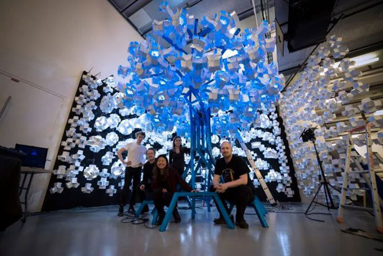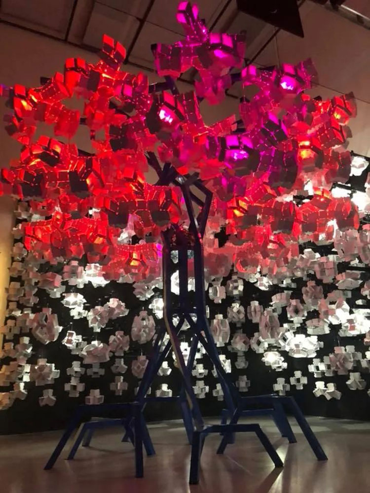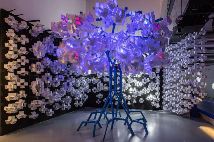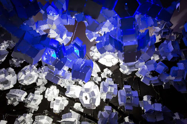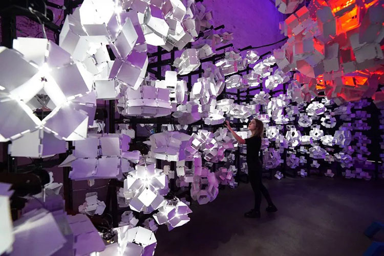 科學家Bas Overvelde AMOLF和Studio Overvelde與藝術(shù)家Vasilija Abramovic和Ruairi Glynn合作打造了Edge of Chaos沉浸式藝術(shù)裝置,一棵代表“生命”的機器人樹,周圍是云朵。裝置背后的機器人樹和概念的形成是由Interactive Architecture Lab的設(shè)計師開發(fā)的,它利用了被動和主動幾何結(jié)構(gòu),這些幾何結(jié)構(gòu)包含了我們工作室設(shè)計和開發(fā)的超過25.000個MATHEMAGIC構(gòu)件。交互式表面及其出現(xiàn)的行為是在阿姆斯特丹的AMOLF和倫敦的Bartlett UCL之間的實驗室之間開發(fā)的,旨在慶??缈茖W,藝術(shù)和設(shè)計領(lǐng)域合作的創(chuàng)造性可能性。