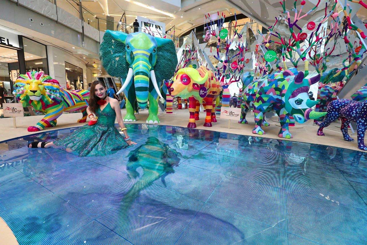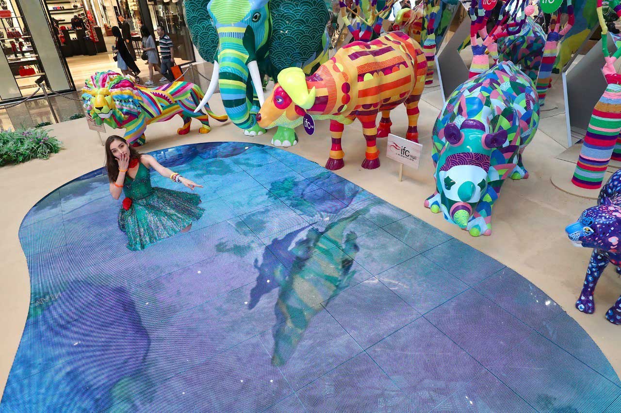 在上海ifc商場(chǎng)一樓中庭,一個(gè)精心打造的逾十多平米的?叢林萬(wàn)花筒 ?區(qū),不僅有“非洲五霸”的3D動(dòng)物雕塑,還有采用鉆石切面設(shè)計(jì)而成的玻璃鏡面藝術(shù)墻,藝術(shù)墻的墻面在光的折射下閃閃發(fā)光,猶如寶石般璀璨奪目,又好似萬(wàn)花筒一般,絢麗多彩、變化萬(wàn)千。非洲五霸,聽名字就很霸氣的?非洲五霸 ?,分別為非洲獅、非洲象、非洲水牛、非洲豹和黑犀牛,藝術(shù)家運(yùn)用大面積的明快色彩和極具個(gè)性的圖案藝術(shù),將“非洲五霸”的造型及性格刻畫得惟妙惟肖,霸氣中還略帶了那么一點(diǎn)點(diǎn)萌萌的feel。地面視頻影像裝置,還有這個(gè)超酷炫的?地面視頻影像裝置 ?,可以近距離透過屏幕觀看超逼真的影像,一條身長(zhǎng)逾2米,體型碩大、色彩斑斕的鱷魚,在“湖面”下緩緩游過,感官體驗(yàn)超一流,刺激又驚險(xiǎn)!