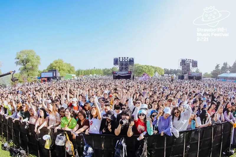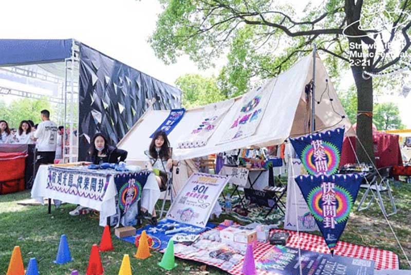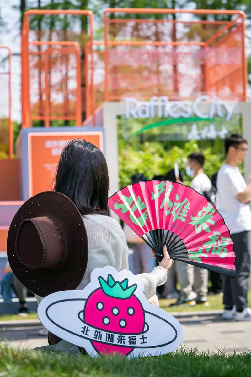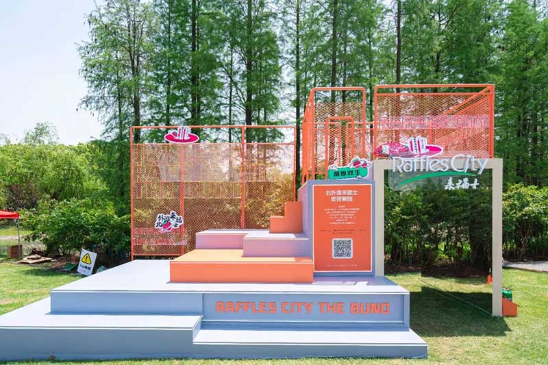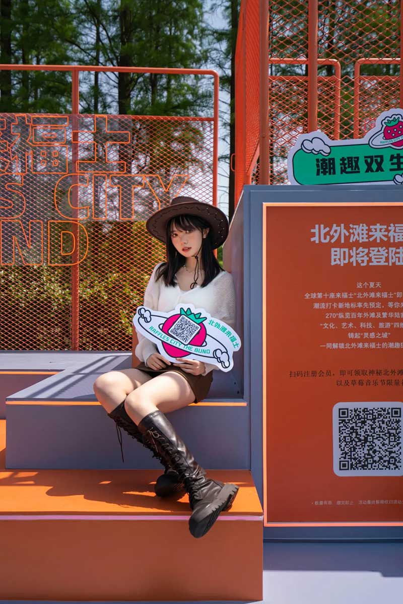 在草莓音樂節(jié)現(xiàn)場,除了精彩的表演,來自各品牌爭奇斗艷的展臺,也很值得一逛。例如從白天火到深夜的北外灘來福士展臺,明亮的熒光橙在一眾展臺里非常吸睛。分為上下兩層,用橙色網(wǎng)格圍繞,怎么拍都好看的北外灘來福士展臺,因為超高的顏值和出片率,一度在現(xiàn)場引來排隊拍照的熱潮。無論是背靠青蔥樹林的二層展臺,或是巧用臺階拉出大長腿的一樓區(qū)域,都是分分鐘出大片的“擺拍圣地”。巧用鏡子元素拉長視覺空間的“秘密基地”,更是惹來神顏小姐姐們前來打卡。入夜后,亮起橙色LED燈的展臺更為炫目。在會發(fā)光的臺階上,跟著主舞臺的音樂節(jié)奏,肆意搖擺身體,感受夜間的徐徐微風(fēng)和粉絲的濃厚熱情,這一屆草莓音樂節(jié)著實(shí)令人難忘。