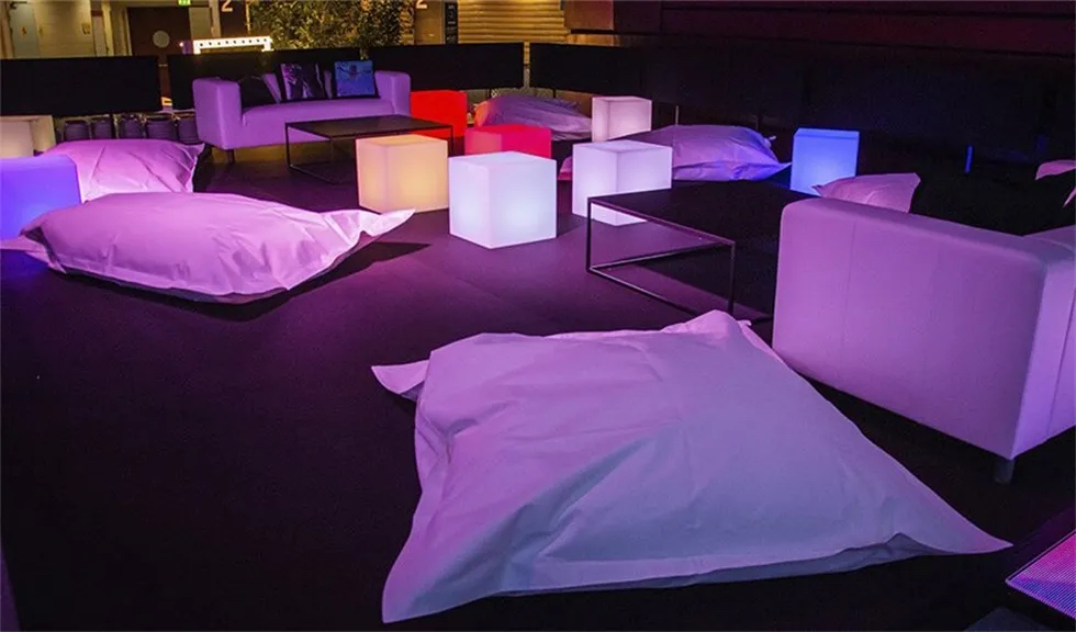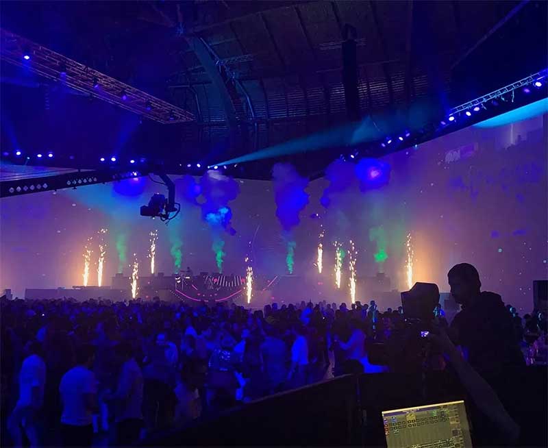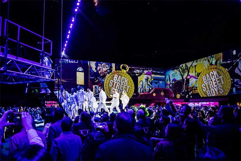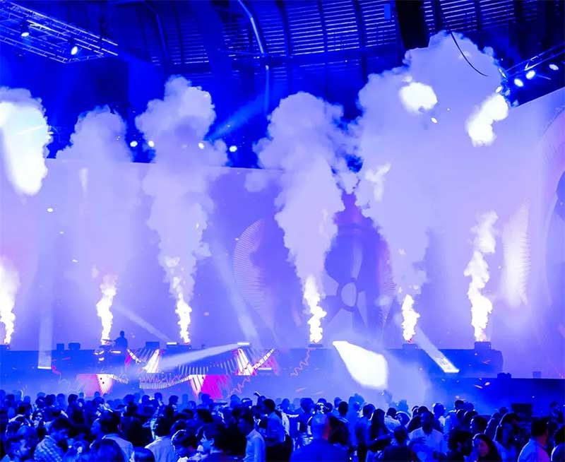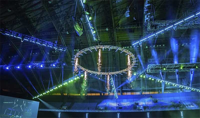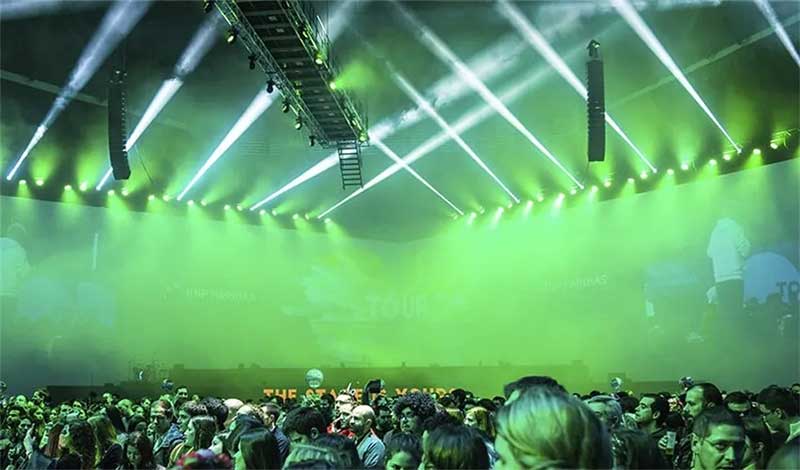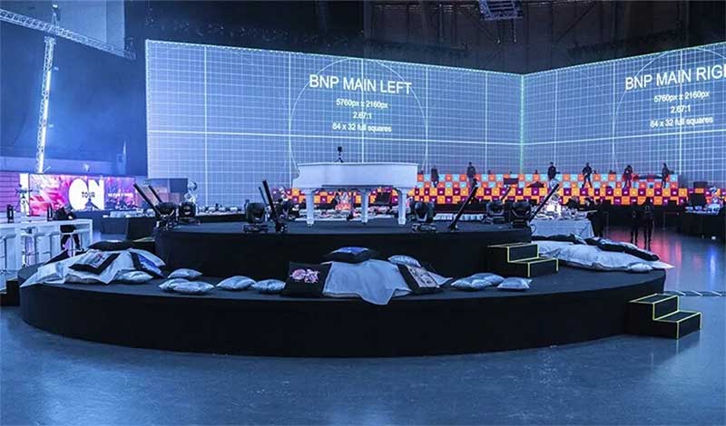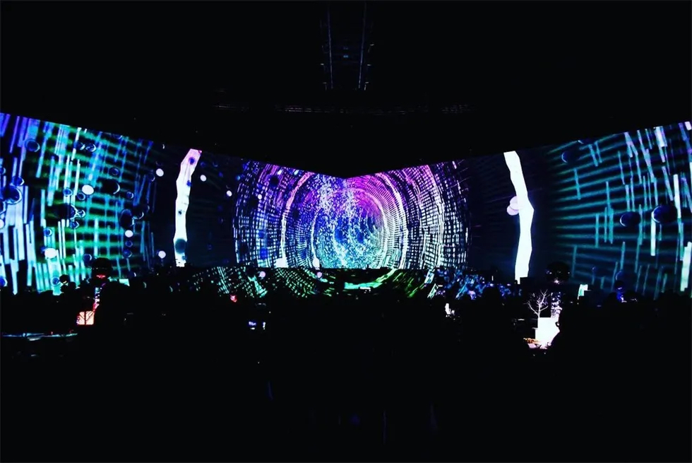 室內(nèi)籃球場是做大型活動的不錯(cuò)選項(xiàng),特別是那些空中有吊點(diǎn)的球場;現(xiàn)場座椅擺放不是傳統(tǒng)的劇院式,采用派對休閑風(fēng)格,觀眾區(qū)以點(diǎn)狀布置的自助餐臺為中心,擺放吧桌和吧凳,以及更加舒適的休閑沙發(fā)為主,并留出大面積的空地,方便客人們自由走動。舞臺區(qū)域則采用了投影機(jī)投射畫面,效果很是震撼。