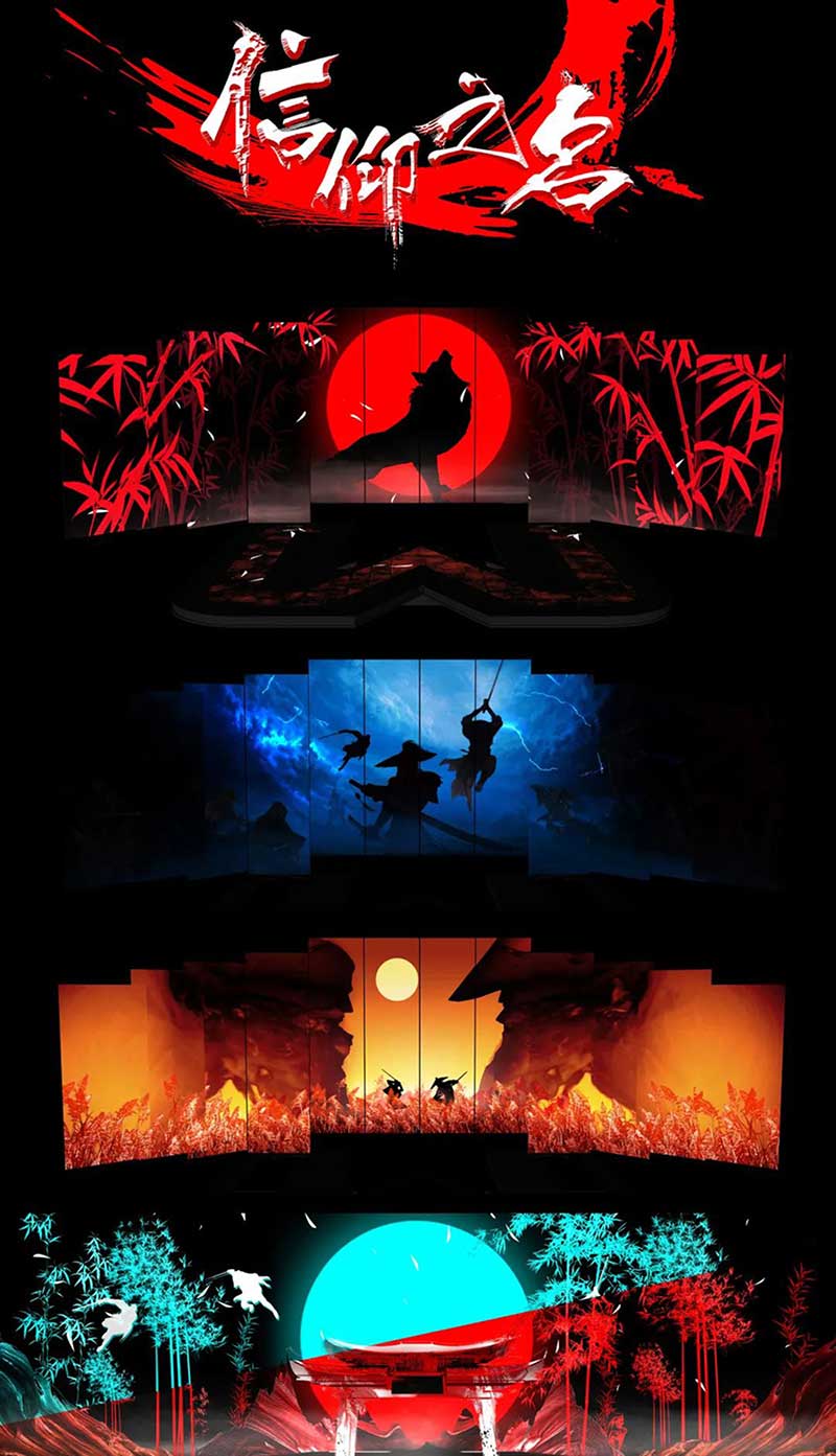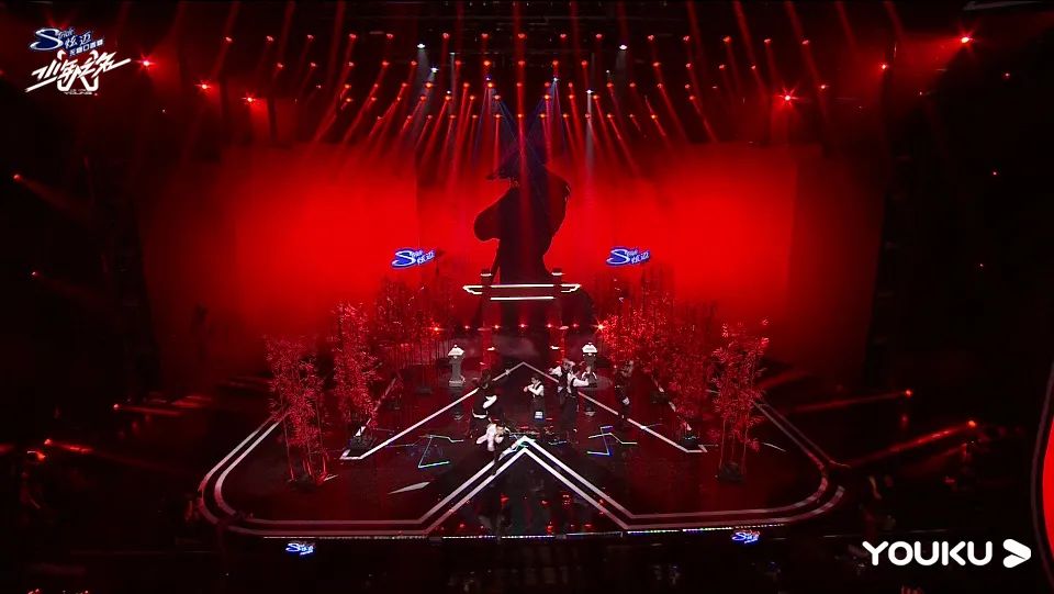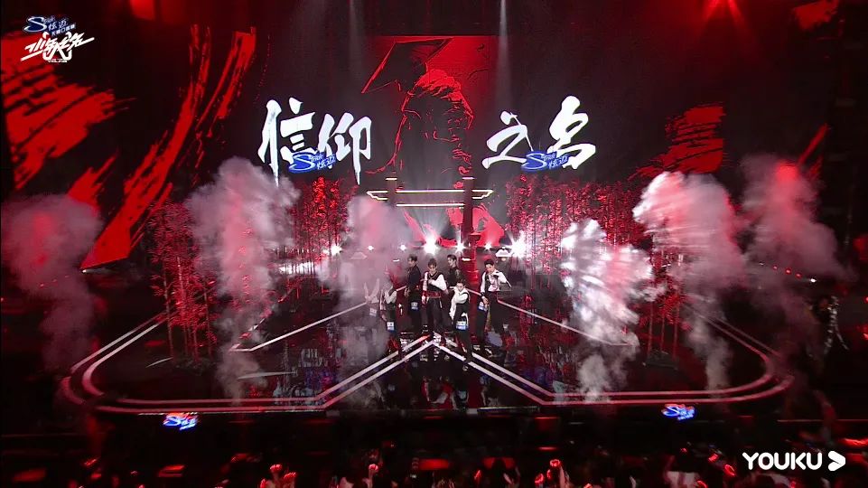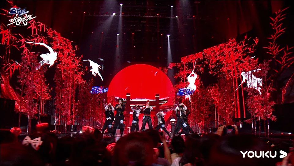 《信仰之名》的開場震撼至極,為了體現(xiàn)少年們在武林之中的英雄氣概,視覺設(shè)計(jì)采用了黑白紅色調(diào)。一位英姿颯爽的少年完美后空翻作為開場動作,現(xiàn)場頓時一聲狂呼!在竹林、紅日的剪影之下,再加上少年們默契且整齊舞蹈,使得整個演出十分震撼!