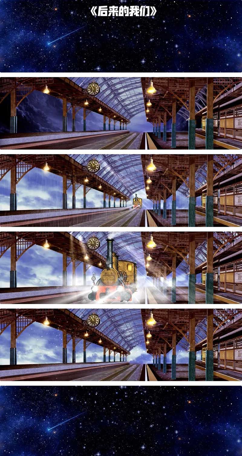 《后來的我們》的開場流行劃過,勾起了那晚最美的“夜色”,少年們坐在星空之下,整個設(shè)計(jì)突出了他們是未來可期的閃耀之星。星空扭轉(zhuǎn)的轉(zhuǎn)場將星空逝去切換到了站臺,一輛火車駛來將歌曲推向高潮,接著雨水降落,配合周圍道具,營造了時間飛逝的氛圍。