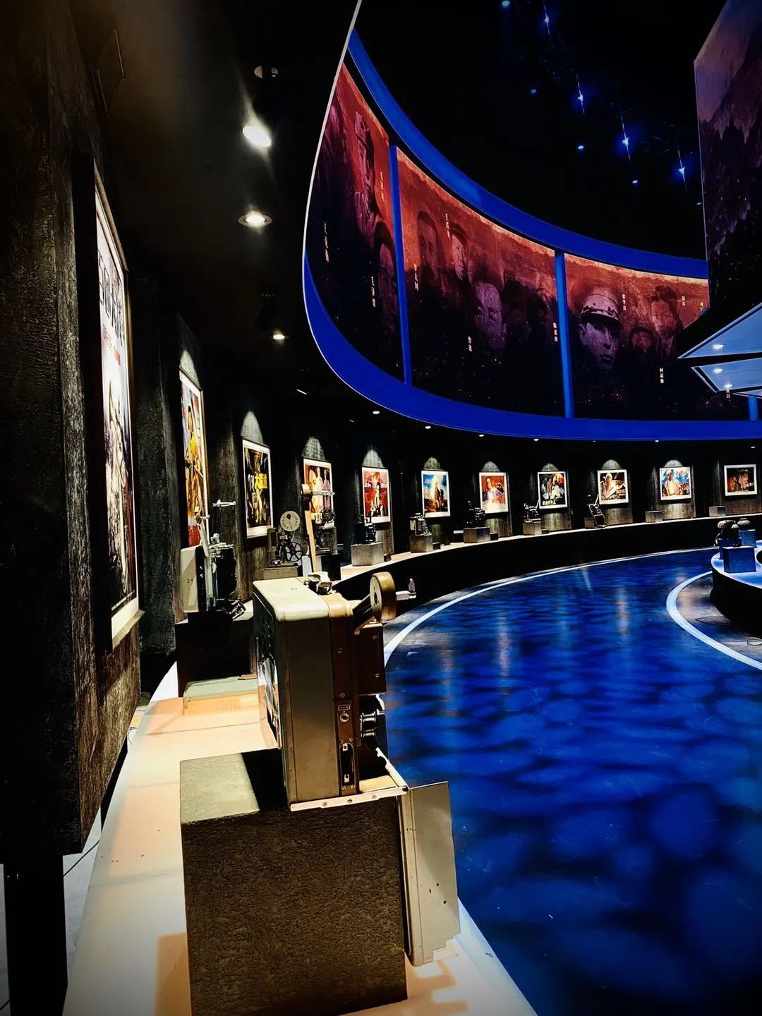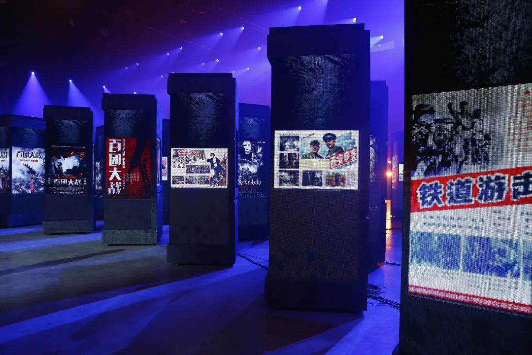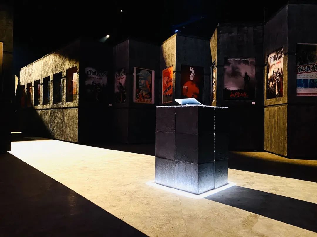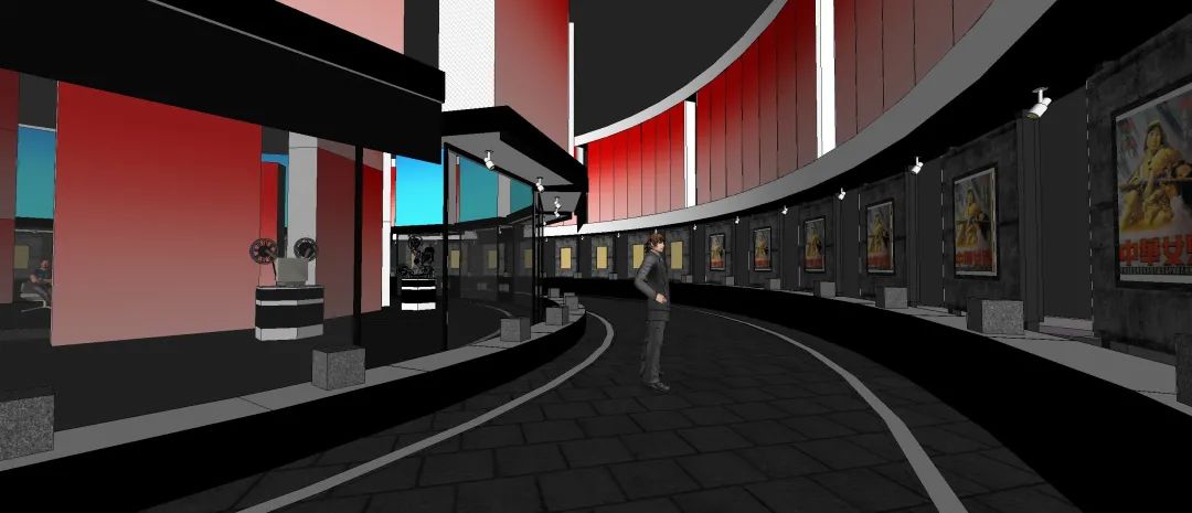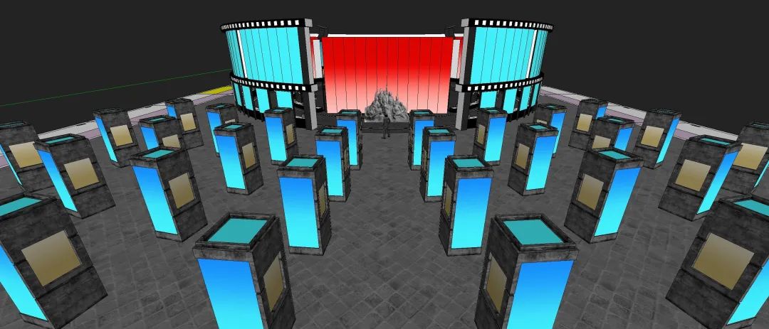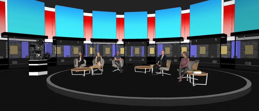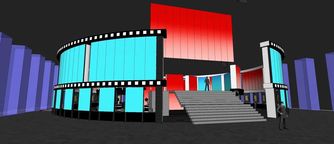 第二:場地中設計了碑林區(qū)和環(huán)屏區(qū)兩個表演空間。碑林區(qū)由40根可移動的石碑立柱組成,每根立柱的兩面和頂面為led,另兩面是海報燈箱,可隨節(jié)目使用更換內容。40根立柱可根據不同節(jié)目的使用需求隨意改變組合造型和擺放位置,用于影視化和情景再現,包括根據交響樂團的需求組合成不同的場景和劃分空間的功能;環(huán)屏區(qū)域為三層雙面屏幕組成的環(huán)形結構。分為外環(huán)、中環(huán)、內環(huán)。中環(huán)和內環(huán)分別由25塊數控升降屏幕組成。因此最終得到了一個可自由變化大小的舞臺,舞臺使用直徑可在11米、25米和36米中隨意切換。在外環(huán)和中環(huán)之間還設置了海報紀念館展覽長廊。在長廊的兩側展示著每期相關的實物海報,在展臺上展示與電影和題材相關的所有道具。這樣多層的環(huán)形結構不僅可以滿足多視角的拍攝,還能隨著人物的行動,進入環(huán)形結構的內部。從真實的場景層層進入不同時空,增加了視覺上的時空層次。而最重要的是能夠將現場拍攝內容自然的帶入到節(jié)目情景化的內容中去,真正的將“沉浸”的概念通過畫面銜接起來,使整個場地的使用以戲劇化的手段呈現出來。