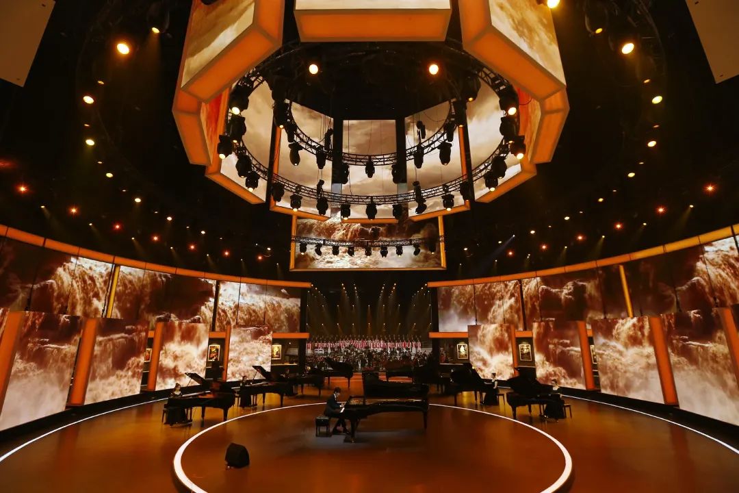 第一:整個舞臺從功能性和實用性角度出發(fā),舍棄了內場觀眾席將舞臺空間最大化,以滿足包含表演、舞蹈、情景再現,影視化拍攝以及大交響樂團的調度。