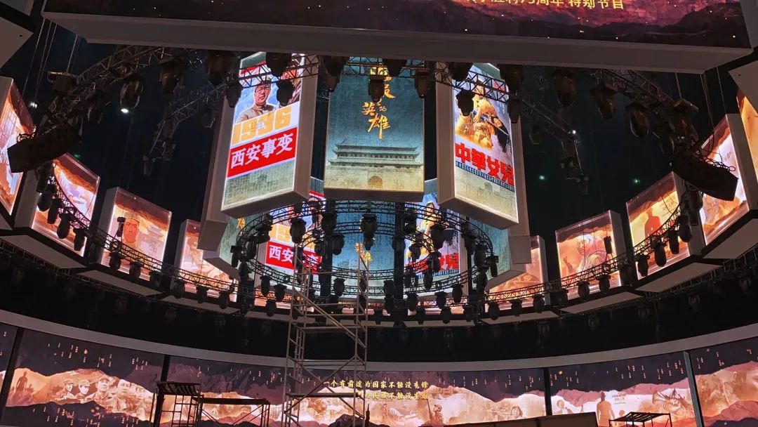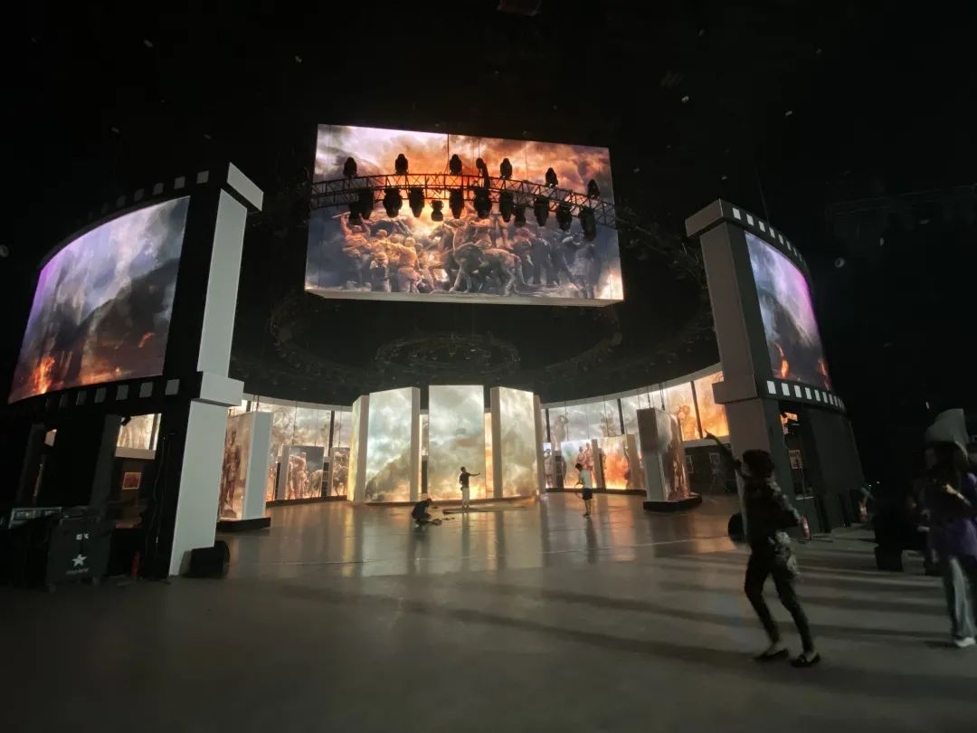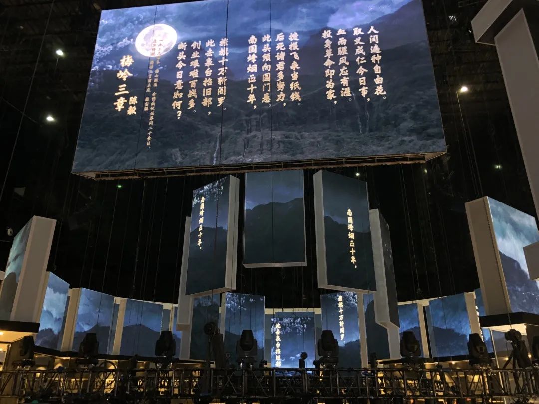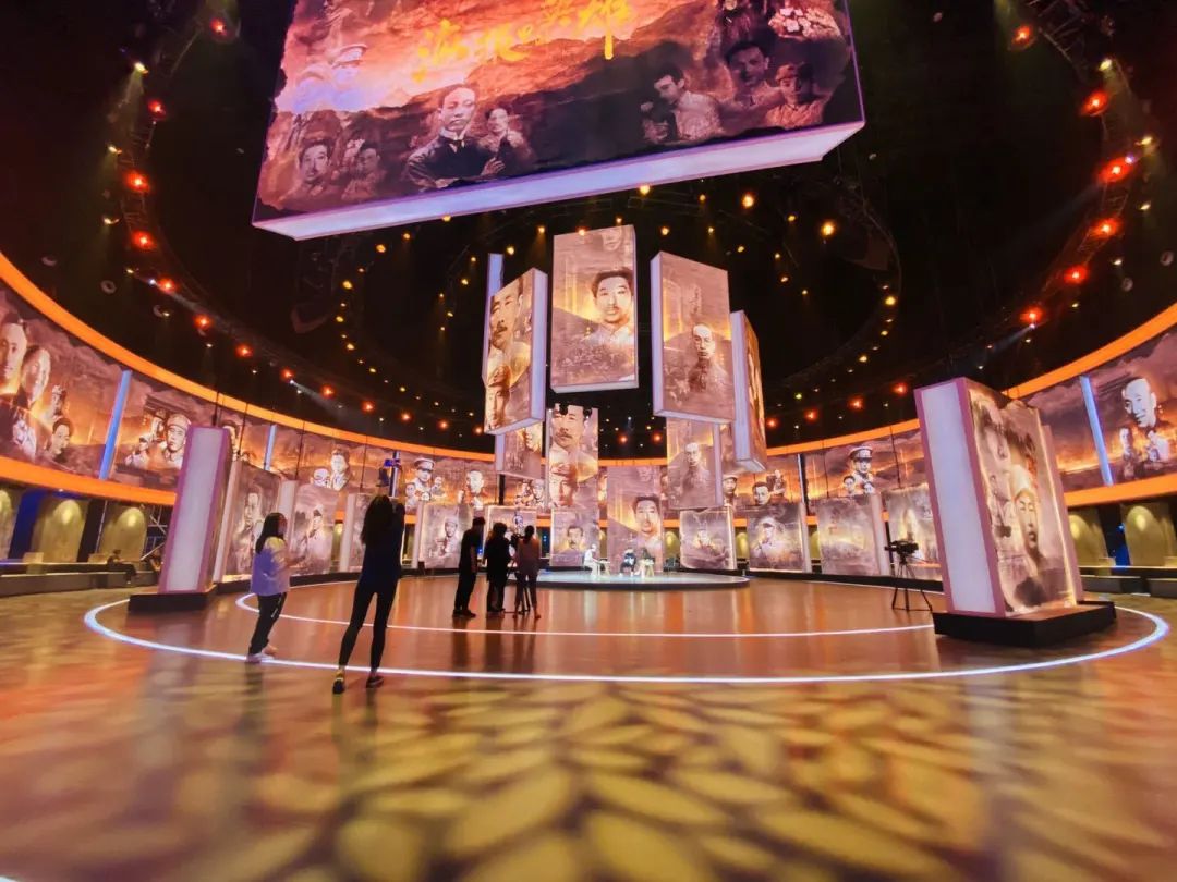 第三:在設計過程中鄭博力求完成大環(huán)繞的概念。這也是舞臺使用方法的另一個體現。場地中劃分的兩個使用空間,既相對獨立又互為背景,這就滿足了現場的拍攝和使用方式不拘泥于某一個特定角度或位置,通過環(huán)形屏幕的升降變化和碑林區(qū)域的組合、劃分,將情景再現和影視化的部分設置在這些環(huán)境中,配合屏幕素材的使用來滿足拍攝畫面不同場景、氛圍和景深的需求,從而將整個錄制場地的每一個位置都可以打造成表演空間。