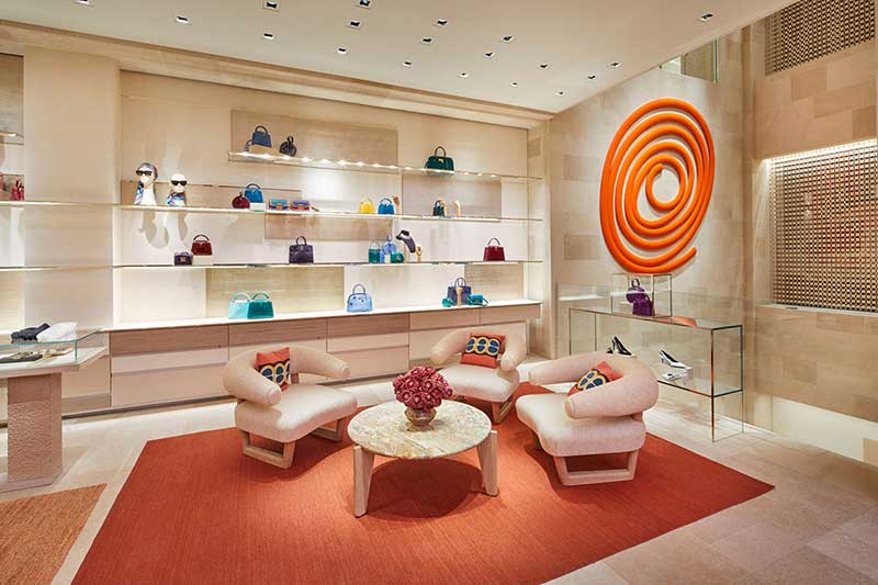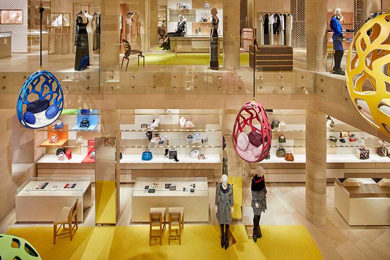 設(shè)計(jì)師將櫥窗展示的戲劇性由外搬到內(nèi)部,把商店的內(nèi)部分隔為多個(gè)寬敞的兩層高空,利用寬敞和多層次的空間呈現(xiàn)了品牌全線產(chǎn)品。穿著精致的道具模特在空間里姿態(tài)各異,配上 Campana Brothers (坎帕納兄弟)的彩色吊椅裝置,彷佛正在進(jìn)行一場(chǎng)時(shí)裝革命。