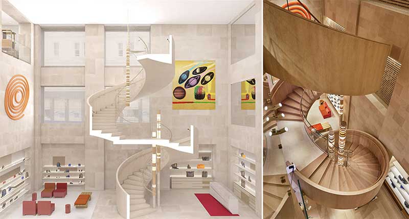 Peter?Marino (彼得·馬里諾)曾經(jīng)在2010年為該店鋪設(shè)計(jì)的發(fā)光 LED 地板和樓梯消失了,被更柔和的雙層螺旋樓梯所取代,將三層樓以優(yōu)雅旋轉(zhuǎn)的形式連接起來。