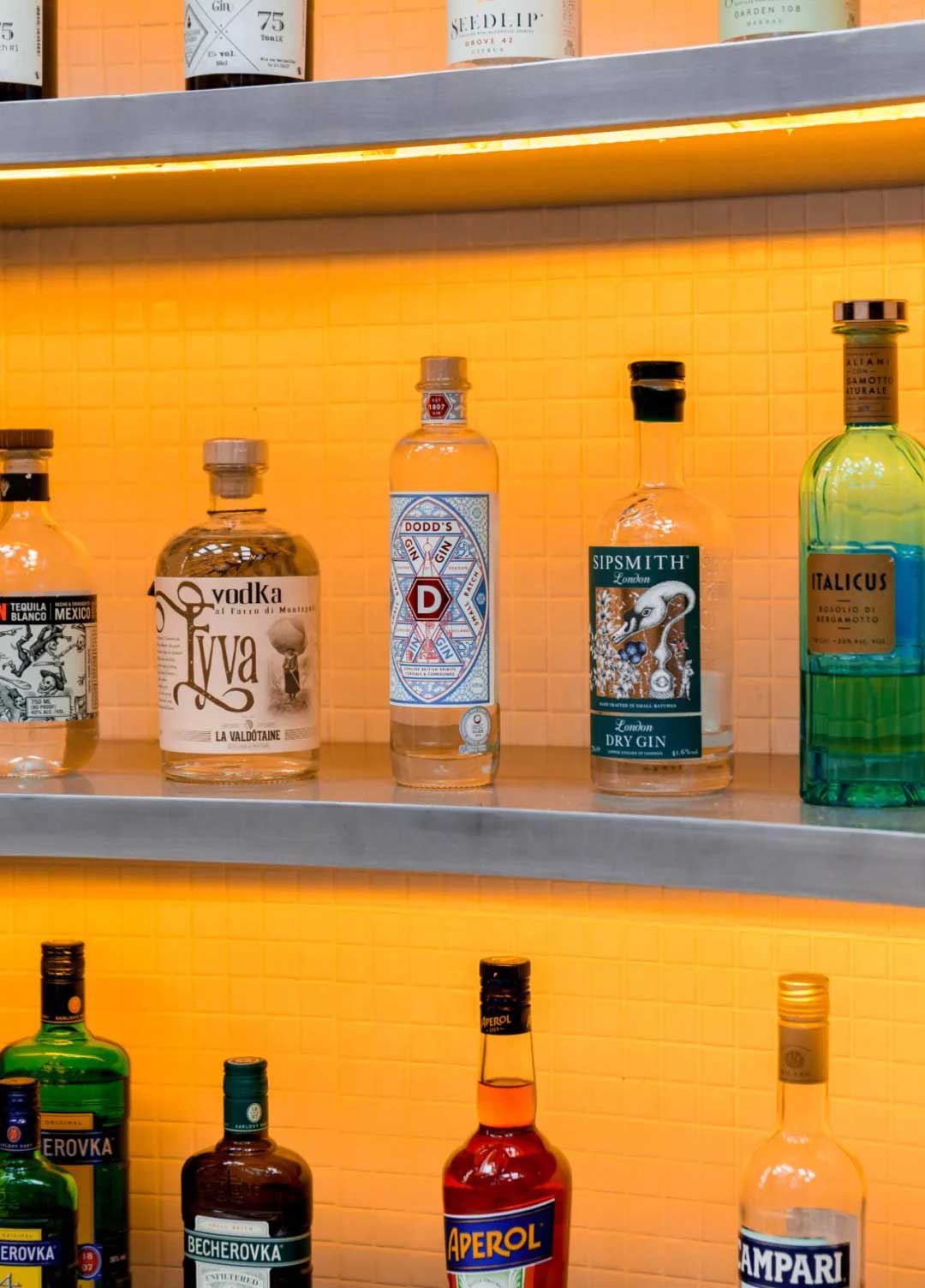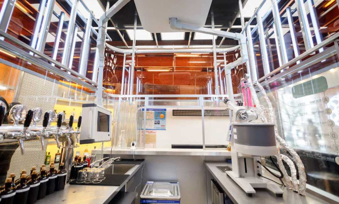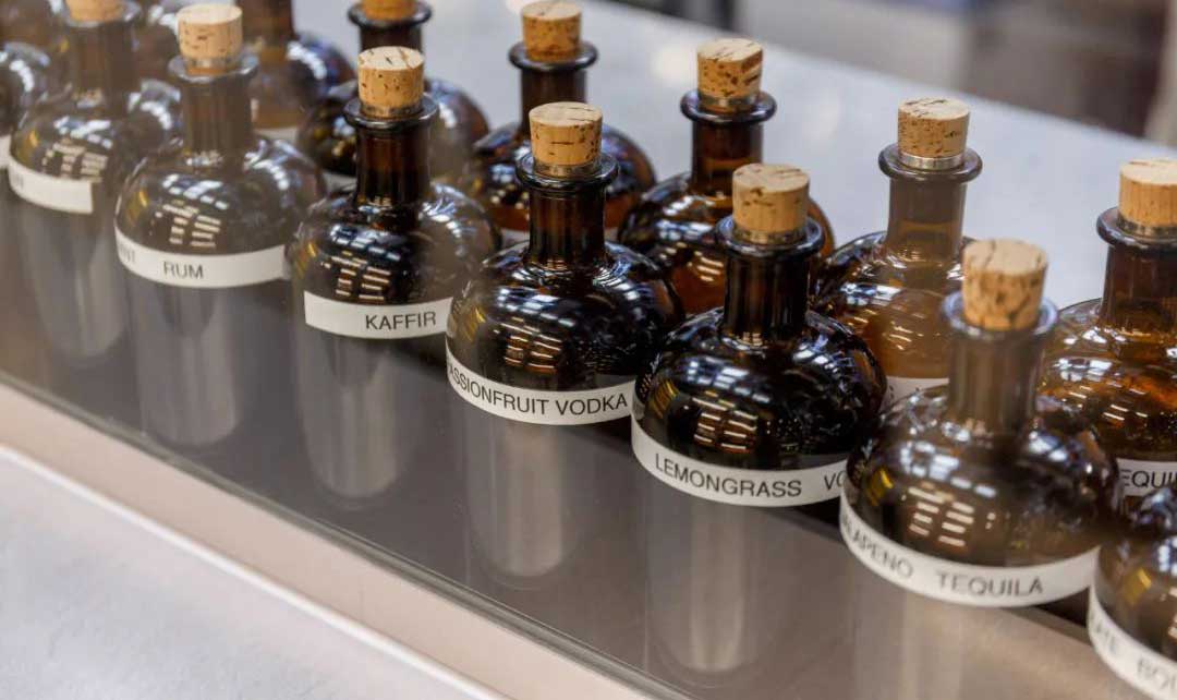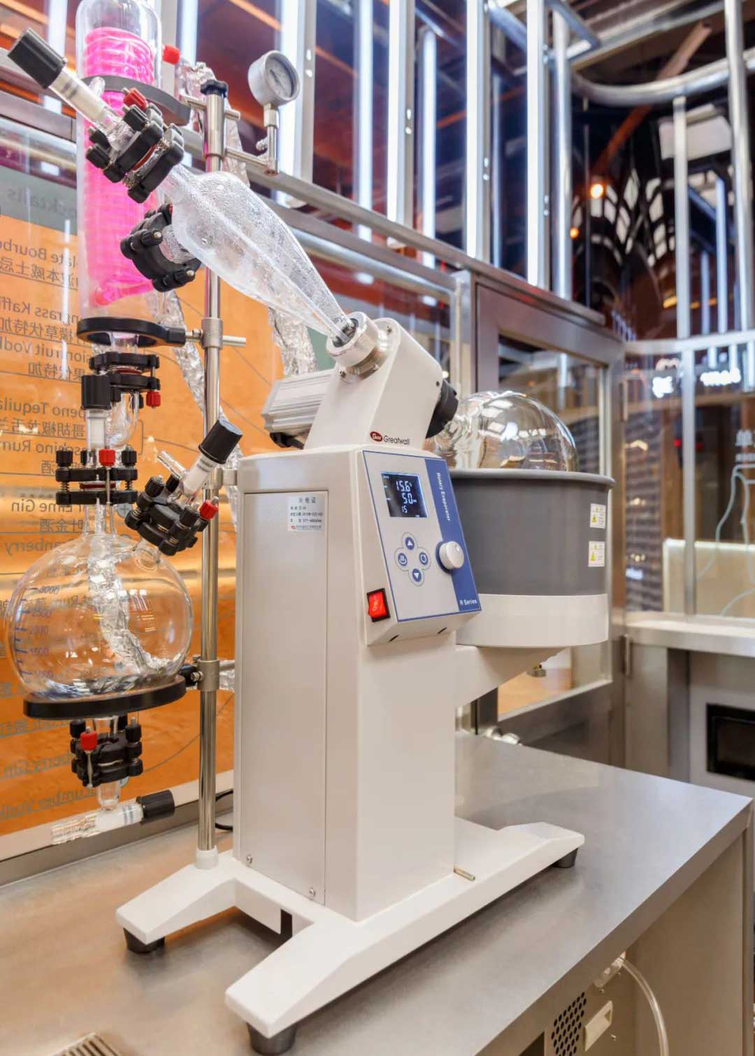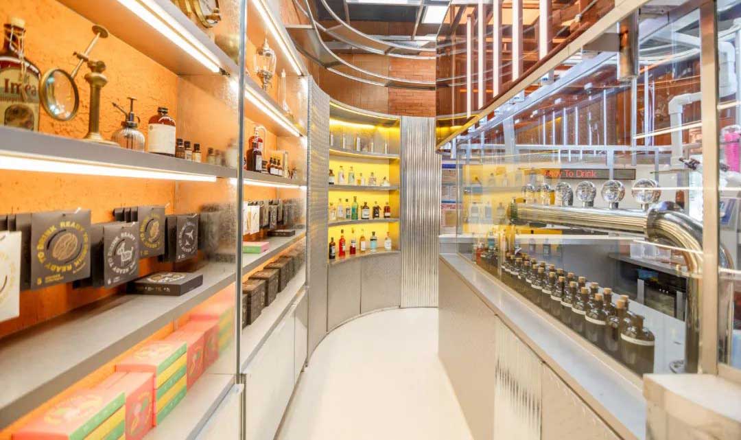 店名RTD意為Ready to drink的縮寫,即時刻準備著來上一口(雞尾酒)的寓意,即點即喝,隨點隨走。店內空間的設計以實驗室為主題,在這里喝到的每一杯飲品都是調酒師精心配比的,真的就像是在實驗室操作一樣。為了整體空間更加活潑輕松,他們采用了多種具有未來科技感的材質互相拼接,在軟裝上則以多種雞尾酒相關的器材來提升空間“酒“的存在感。全透明的飲品制作空間,你完全可以清晰的看到原料萃取及飲品制作的過程。