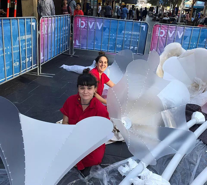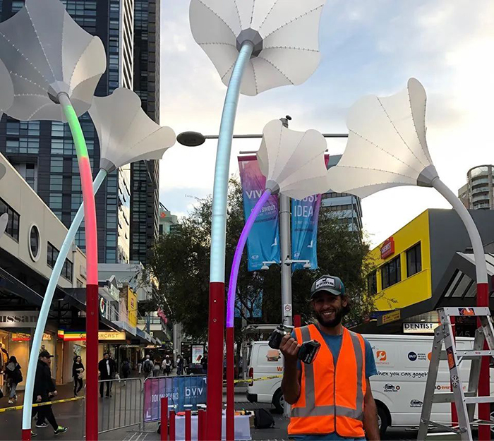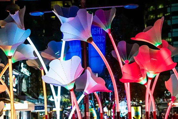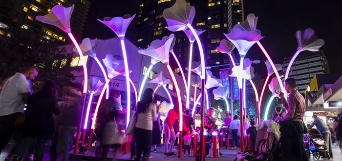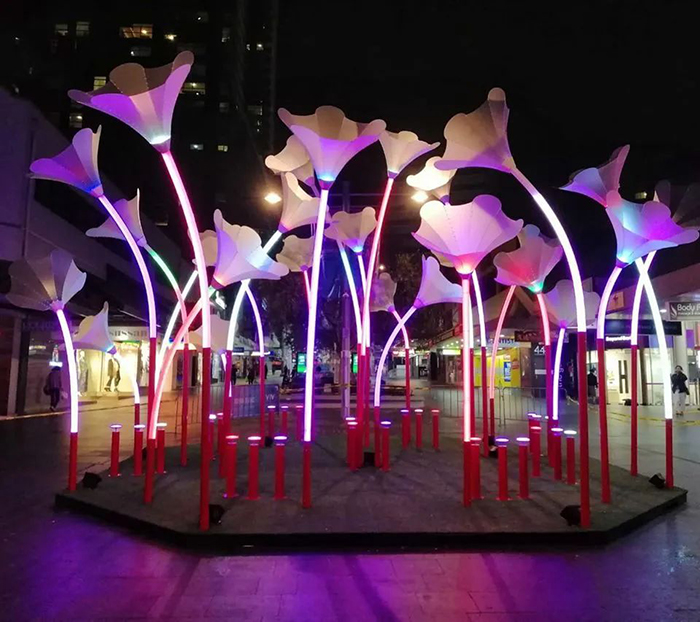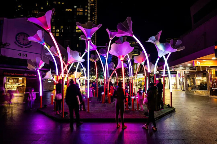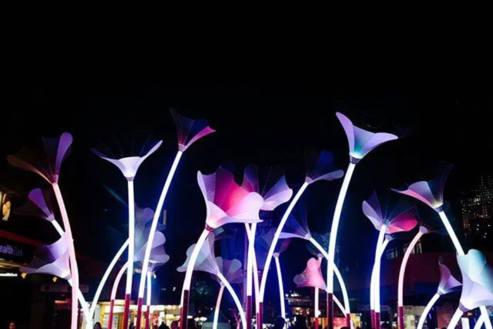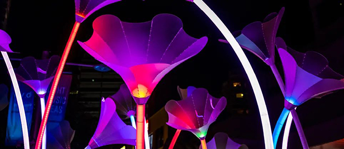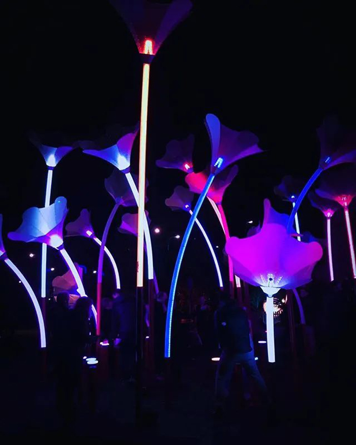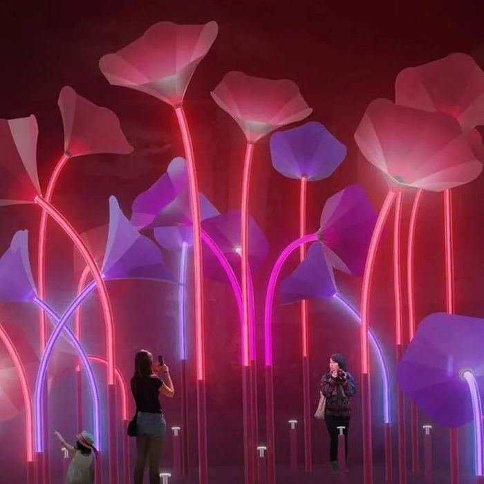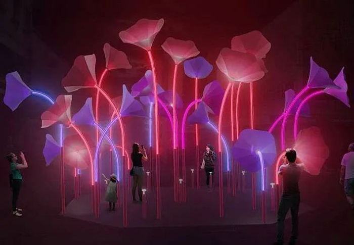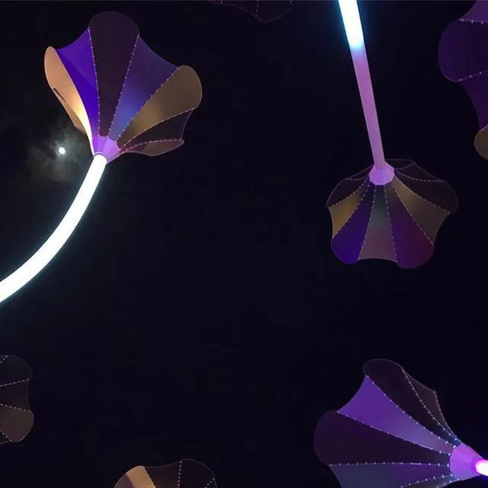 留聲機(jī)是世界上第一款用于播放聲音記錄的電動(dòng)設(shè)備。這件互動(dòng)裝置藝術(shù)作品的靈感正是來(lái)自于留聲機(jī)喇叭(放音器)的形態(tài)。當(dāng)27朵喇叭花從2米到6米的高度在你之上時(shí),你將體驗(yàn)一個(gè)巨人的音樂(lè)花園。散落在“喇叭花叢”周圍的互動(dòng)按鍵則模擬了“小號(hào)”上活塞的樣式。當(dāng)你沉浸在巨大的“喇叭花”花園里時(shí),你會(huì)覺(jué)得自己好像縮小了。每當(dāng)觀眾按動(dòng)按鍵時(shí),對(duì)應(yīng)的“喇叭花朵”將會(huì)鳴響音符,聲音由鼓、長(zhǎng)號(hào)、小號(hào)和薩克斯管組成。發(fā)揮巨大的喇叭鍵,你就能制作屬于自己的花藝聲光表演。藝術(shù)家與多位音樂(lè)家一起,為作品創(chuàng)作了不同音高的特制“號(hào)角”音效,與繽紛的燈光效果一起激活夜晚。