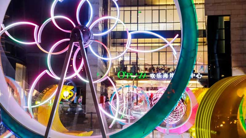 在歡樂(lè)海岸微風(fēng)廣場(chǎng),由“狂歡吧”“椰樹(shù)的花”“O!! Garden”共同組成的裝置打造全場(chǎng)域美好氛圍,隨時(shí)隨地都能遇見(jiàn)不同形態(tài)的 “花”。藝術(shù)家團(tuán)隊(duì)運(yùn)用大量的色彩渲染,通過(guò)色彩產(chǎn)生記憶,觸動(dòng)情緒,改變?nèi)藗冊(cè)诋?dāng)中行走的狀態(tài),移步移景,感受“花”的生命力與能量。
