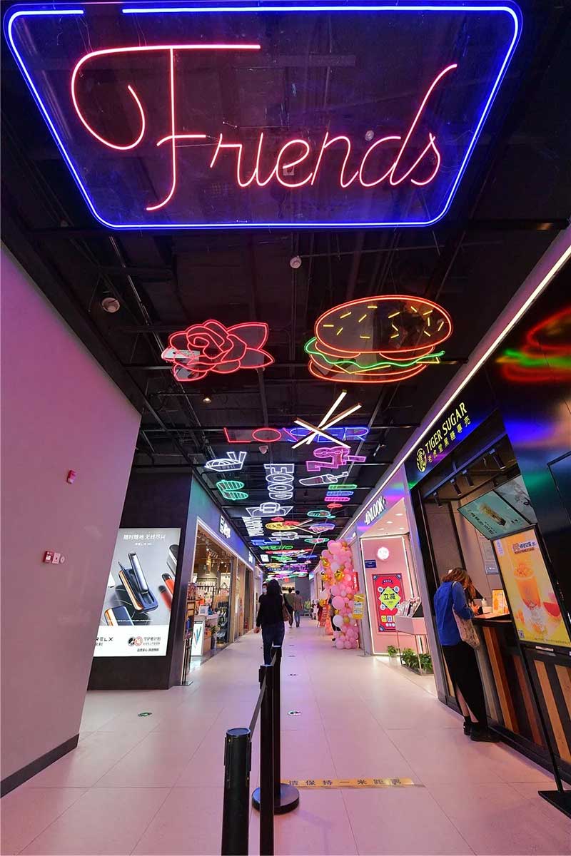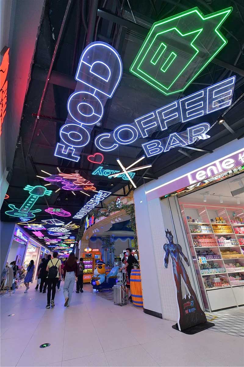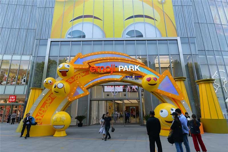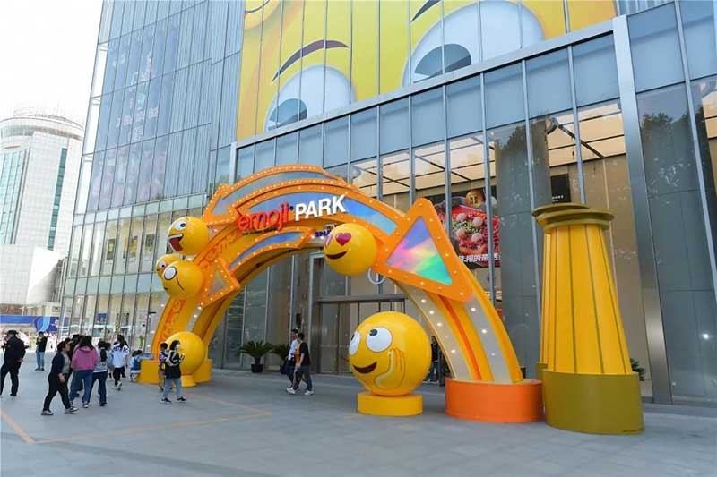 南門入口區(qū)就是主要的重點地標(biāo),從百多表情中挑選了適合emoji公仔的可愛和個性化表情,帶出城市動感的節(jié)拍。目的就是要把戶外入口的位置,設(shè)計成emoji park主題樂園入口,這里適合拍照打卡,和自己心愛的emoji公仔來個合影!南門入口由12個大小不一的emoji造型和16米寬的箭頭拱門組成,用了超過300個燈泡作為點綴營造夜景氛圍,從而做出游樂場的感覺。
