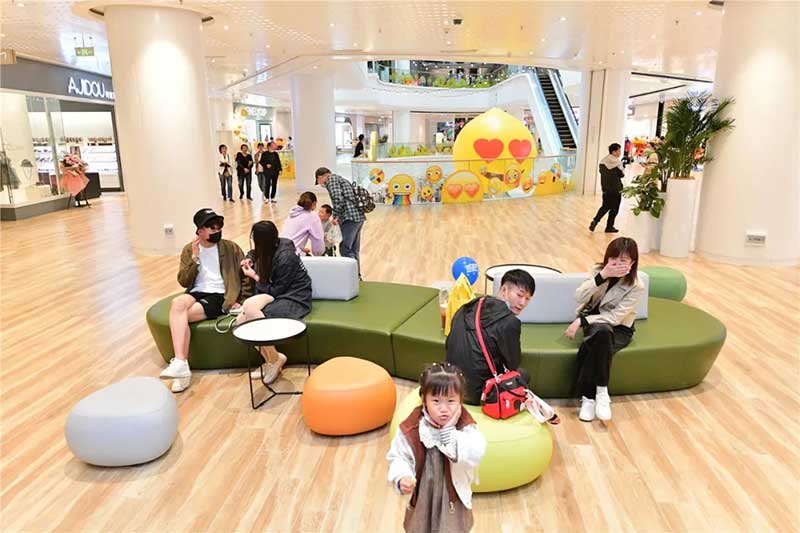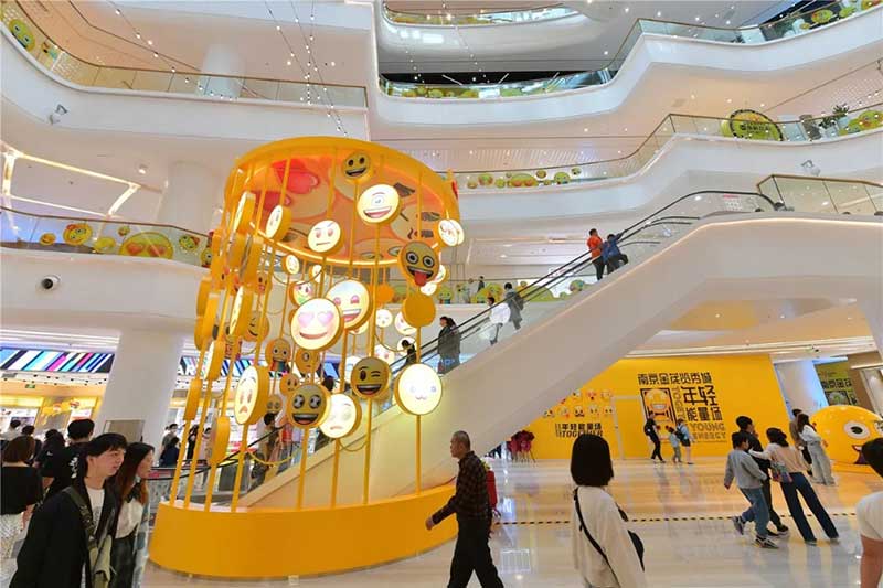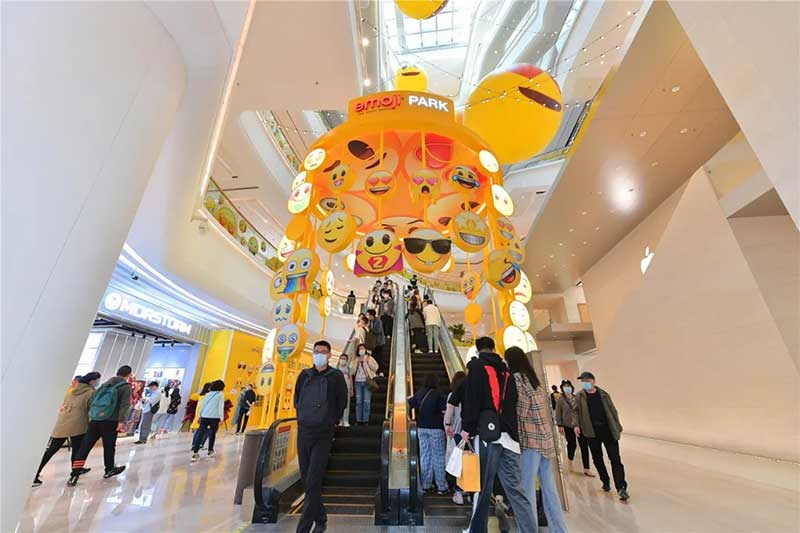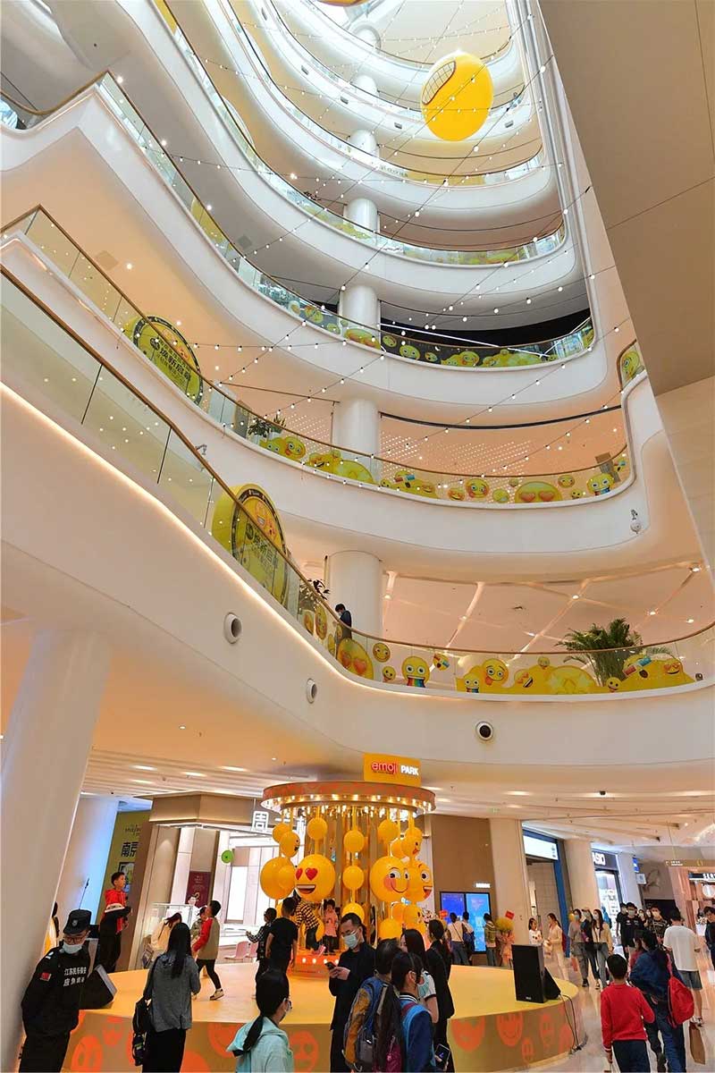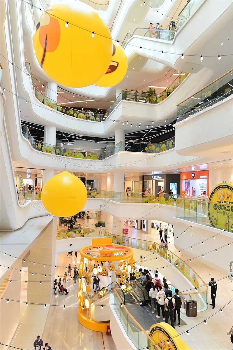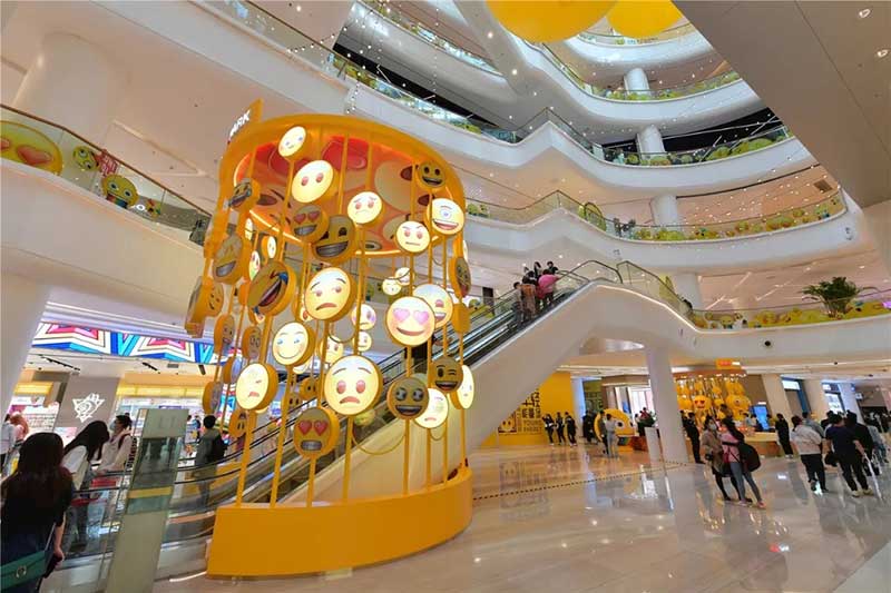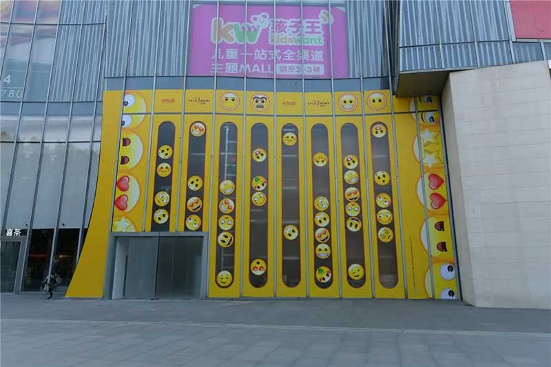 全球潮流IP emoji重磅打造emoji park 帶來一場歡樂盛宴,本次設(shè)計有四大亮點,在構(gòu)思的初期考慮利用感受來構(gòu)想,主題設(shè)計上考慮大家越來越離不開手機作為多媒體閱讀,所以大玩emoji表情包設(shè)計就橫空出世了。如今購物已經(jīng)離不開虛擬加實體,在設(shè)計意念上當(dāng)然非開心主題莫屬啦,把全新的覽秀城帶出更年青,時尚,活力來?;盍σ卜謨?nèi)外,所以意念上是把年青人的心聲用emoji表達!貫通地鐵及商業(yè)空間,設(shè)計了多個大型emoji公仔區(qū)域、這個是必經(jīng)通道,而為了配合購物中心加大吸引力和加強玩味的要求,一些趣味性的游戲裝置和大型墻畫將連接連廊的前端和轉(zhuǎn)接位!