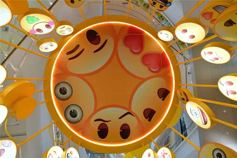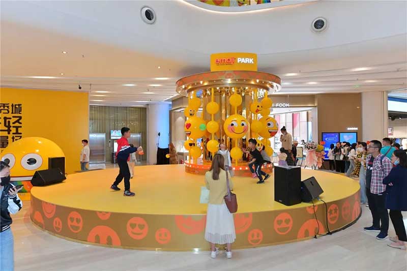 扶梯入口處利用超過80個emoji表情來營造一個圓形羅馬式入口的造型,而這種造型的工程在落地時效果圖與還原度是非常重要的,尺寸要非常精準(zhǔn)。這里的設(shè)計加入了一些燈箱發(fā)光效果和一些燈光配合emoji的游樂場主題風(fēng)格!為了要設(shè)計出一個開幕的舞臺又起到裝飾性作用,便把旋轉(zhuǎn)木馬的主題變成一個可愛的emoji旋轉(zhuǎn)木馬,裝飾隨著燈光的轉(zhuǎn)變及金色鏡面投射使得此場景變得十分精致可愛!