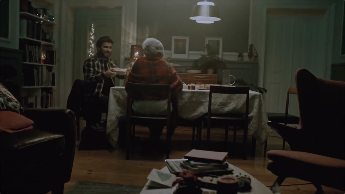 圣誕夜,兒子一家正陪著母親用餐,樓下一位年輕男子突然按響門鈴。頓時(shí),兒子、母親的神色都起了變化。兒子一家立馬起身穿衣,留下禮物后便道別離開。似乎是刻意不想與摁門鈴的人見面,兒子一家選擇走樓梯下樓,年輕男子乘了電梯。
