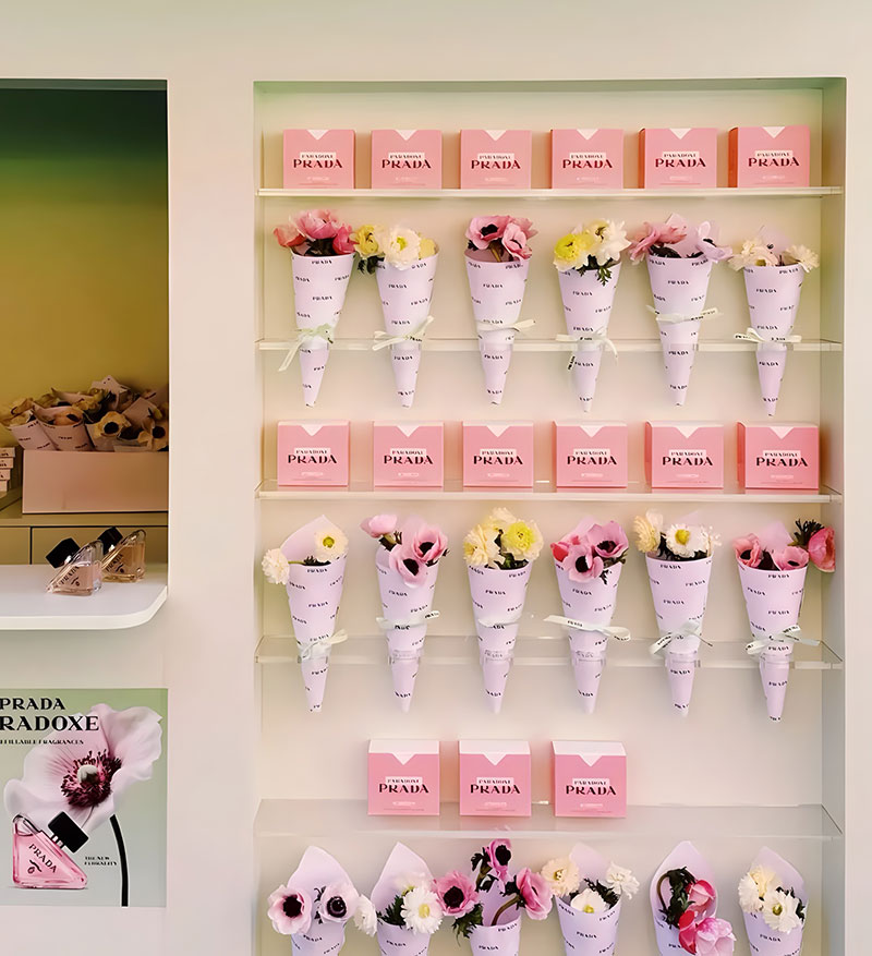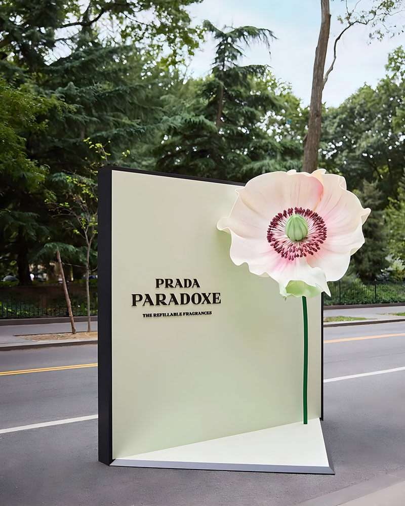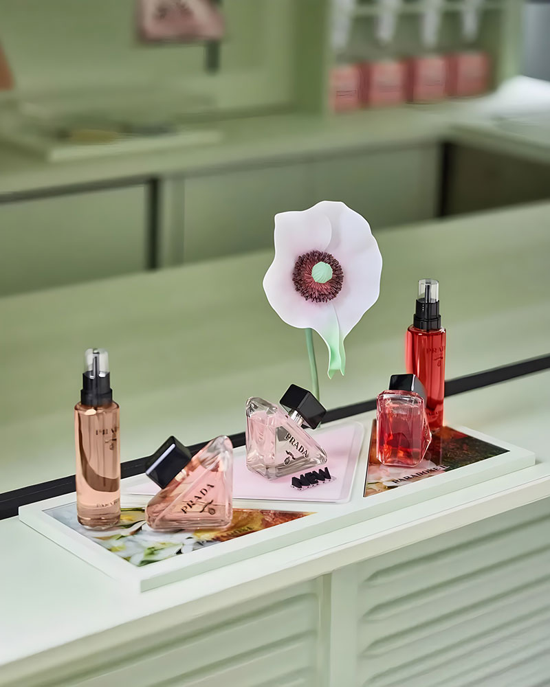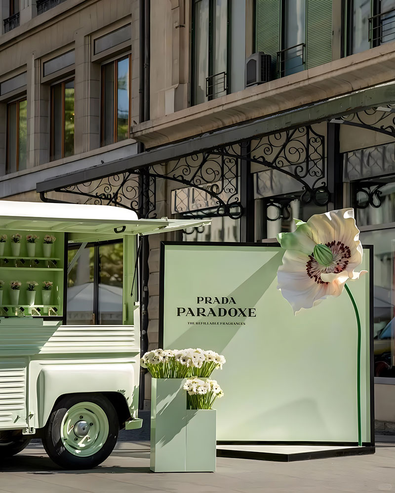 為了推廣 Paradoxe Virtual Flower 香水,普拉達精心設(shè)計了備受矚目的時刻,注重細節(jié)與設(shè)計,沉浸式的氣味體驗室,充滿香水氣泡,精心策劃的花市。