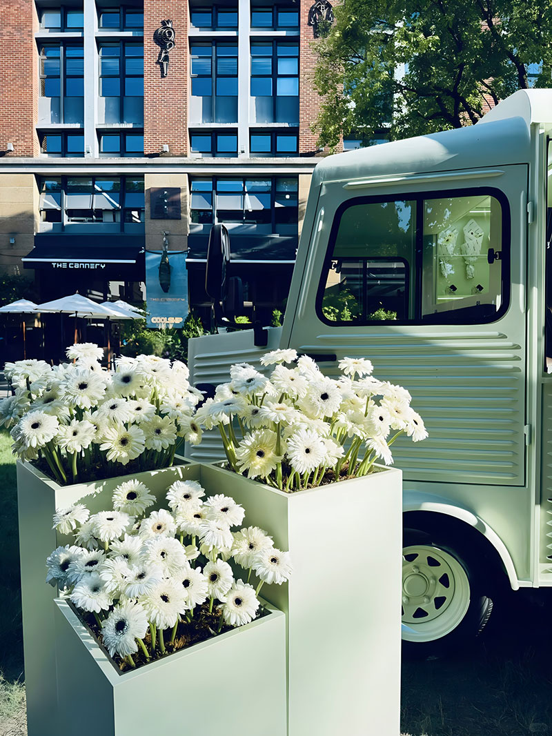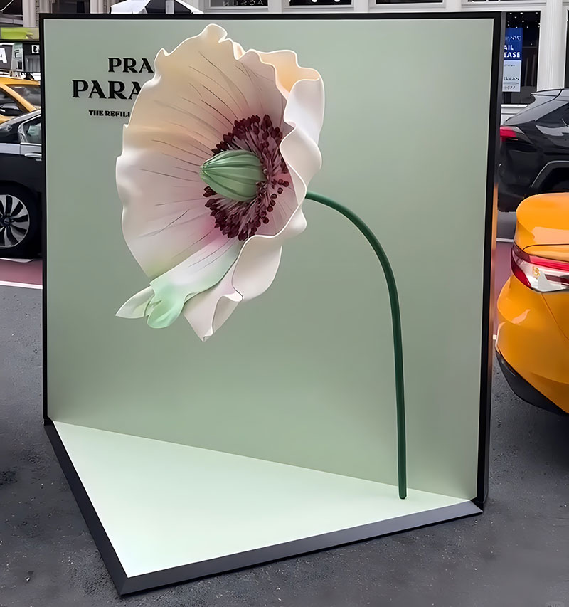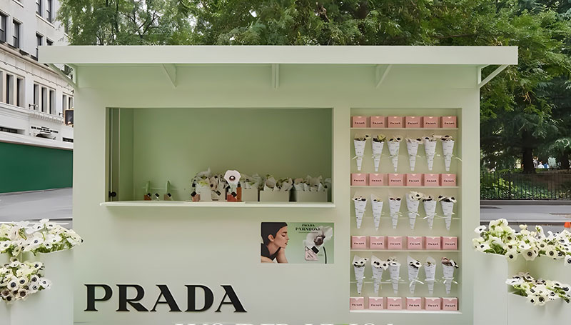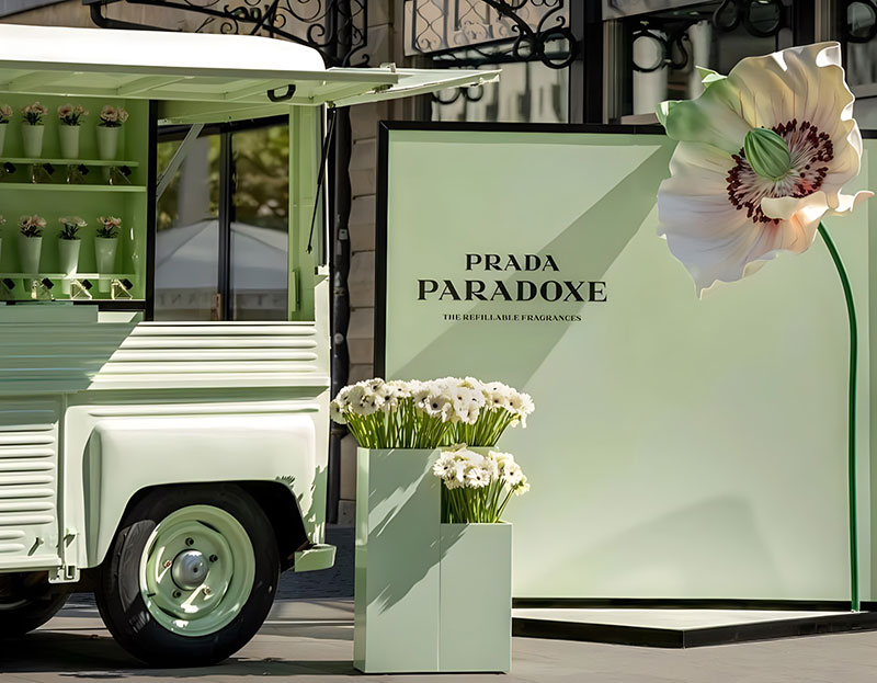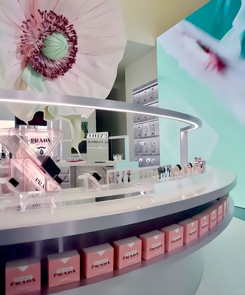 為了推廣 Paradoxe Virtual Flower 香水,普拉達精心設(shè)計了備受矚目的時刻,注重細節(jié)與設(shè)計,沉浸式的氣味體驗室,充滿香水氣泡,精心策劃的花市。