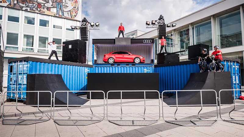 在柏林會議中心,奧迪以發(fā)布新的奧迪A3轎車為目的舉辦了一場快閃店活動,并在活動前面制作了一個獨特的臨時舞臺空間,在繁忙的柏林周末,集街頭風(fēng)格、集裝箱和驚心動魄的舞蹈表演于一體,用28場表演吸引了大批觀眾駐足欣賞了解。