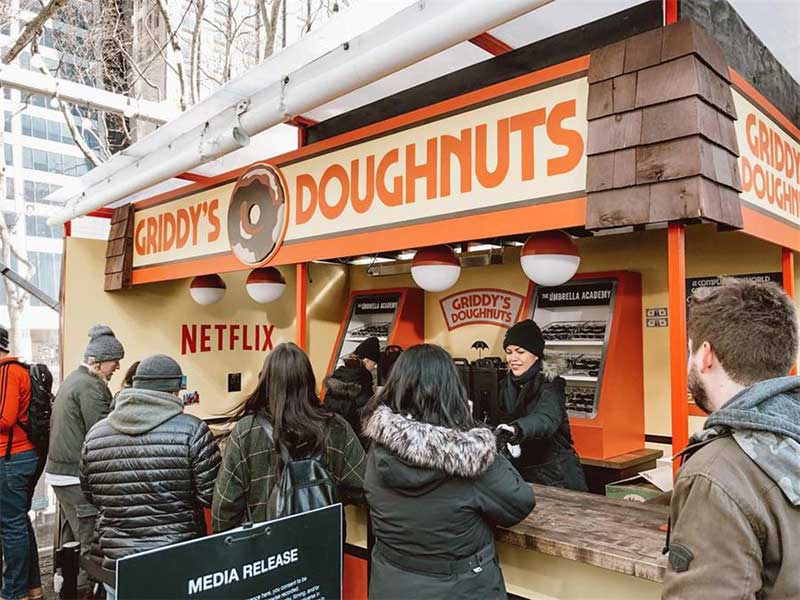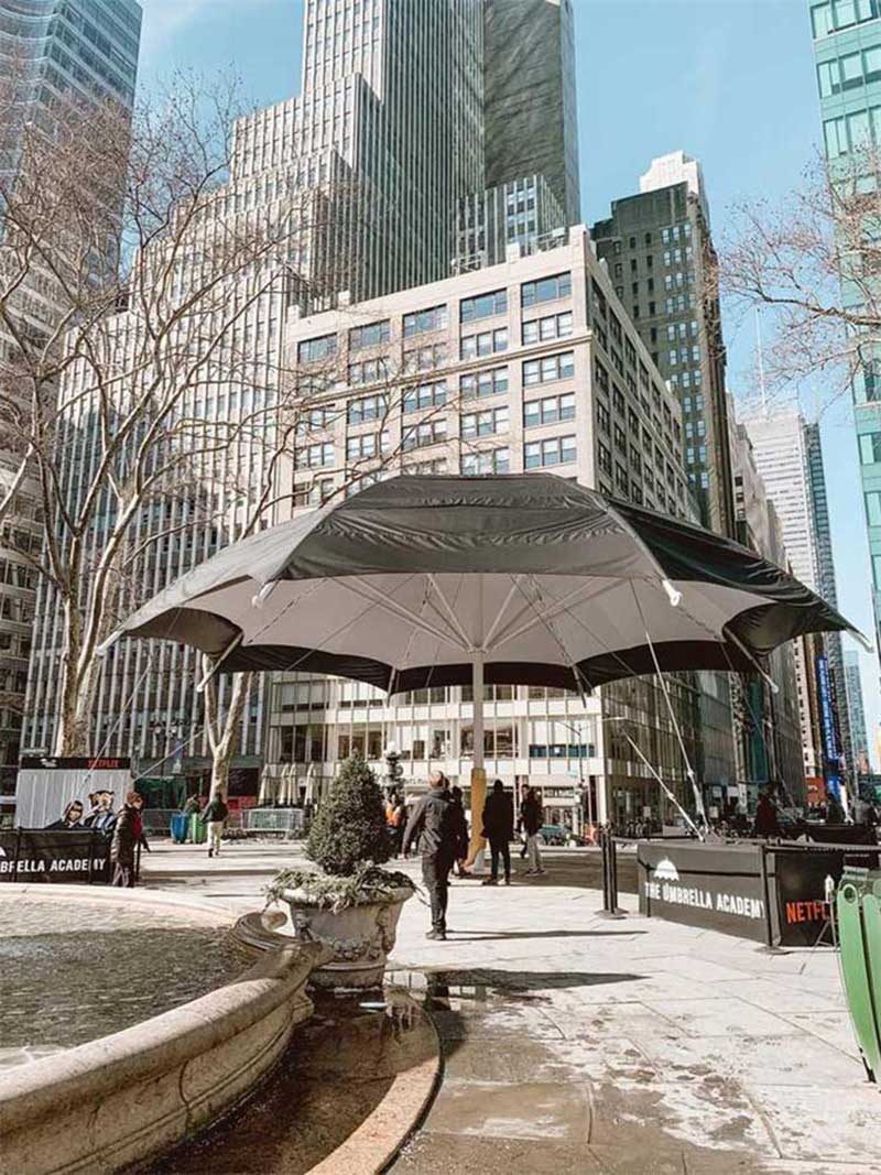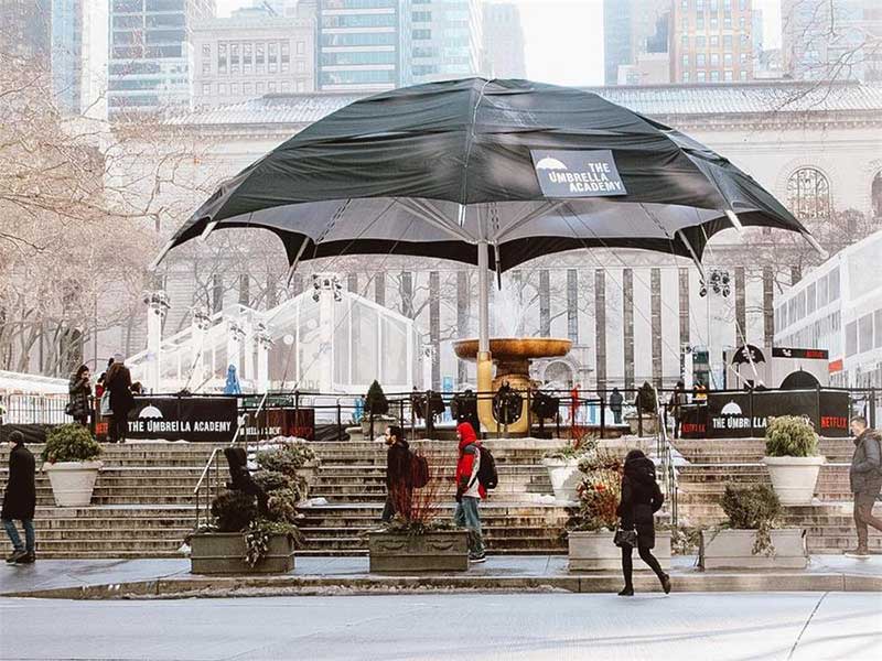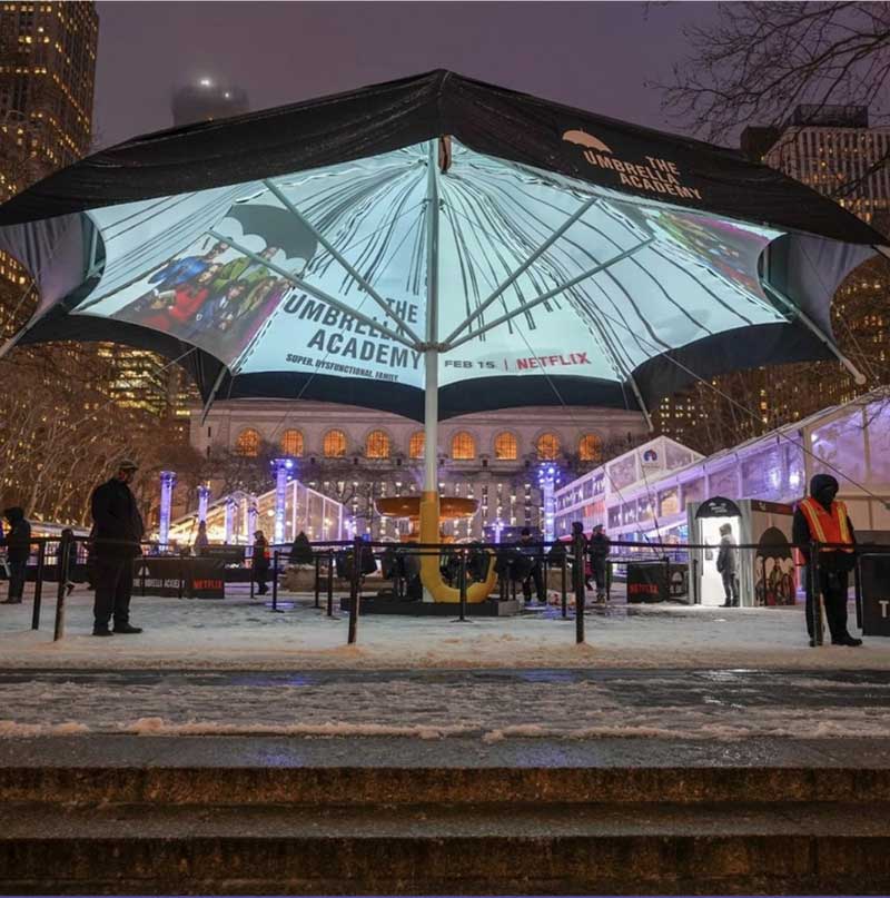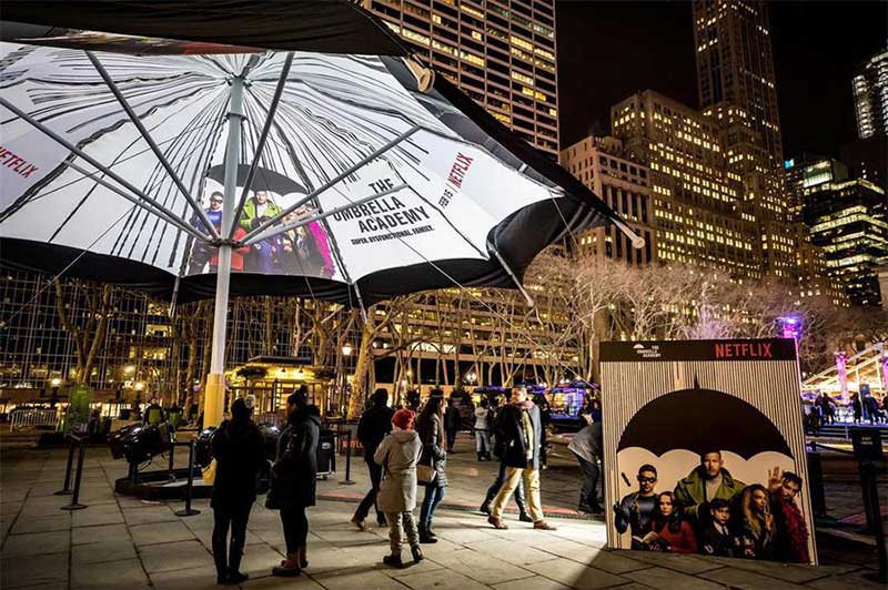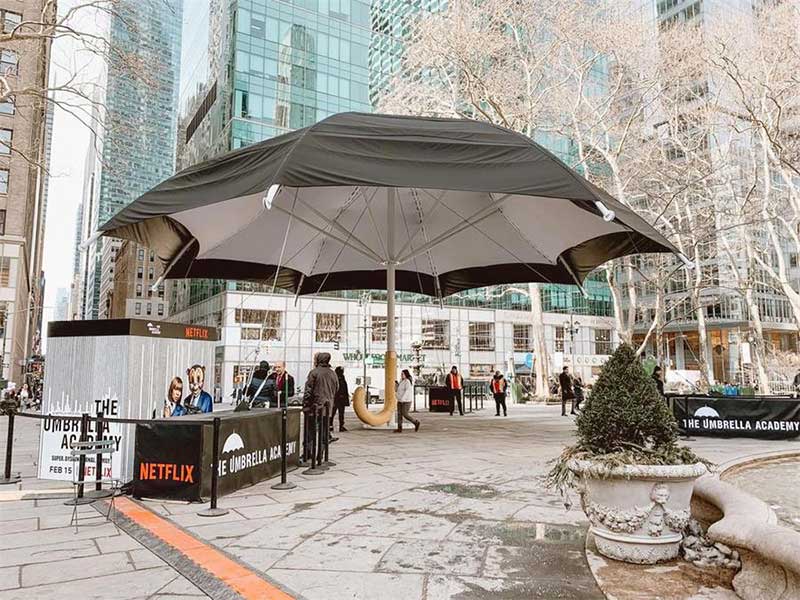 網(wǎng)飛(Netflix)為了推廣其新劇集《雨傘學(xué)院》,在布萊恩特公園制作了一個巨大的雨傘體驗?;顒蝇F(xiàn)場的體驗包括一把32英寸的巨型雨傘和雨傘內(nèi)6分鐘長的動畫投影映射視頻,現(xiàn)場免費的食物和飲料,與劇集有關(guān)的活動禮品,以及一個自拍屋?;顒又械囊粓隽钊梭@喜的婚禮和雨傘快閃活動也是這一活動的亮點!