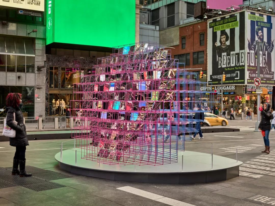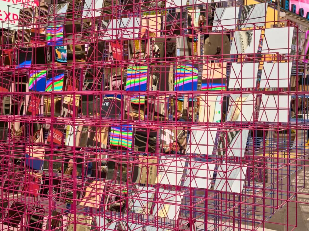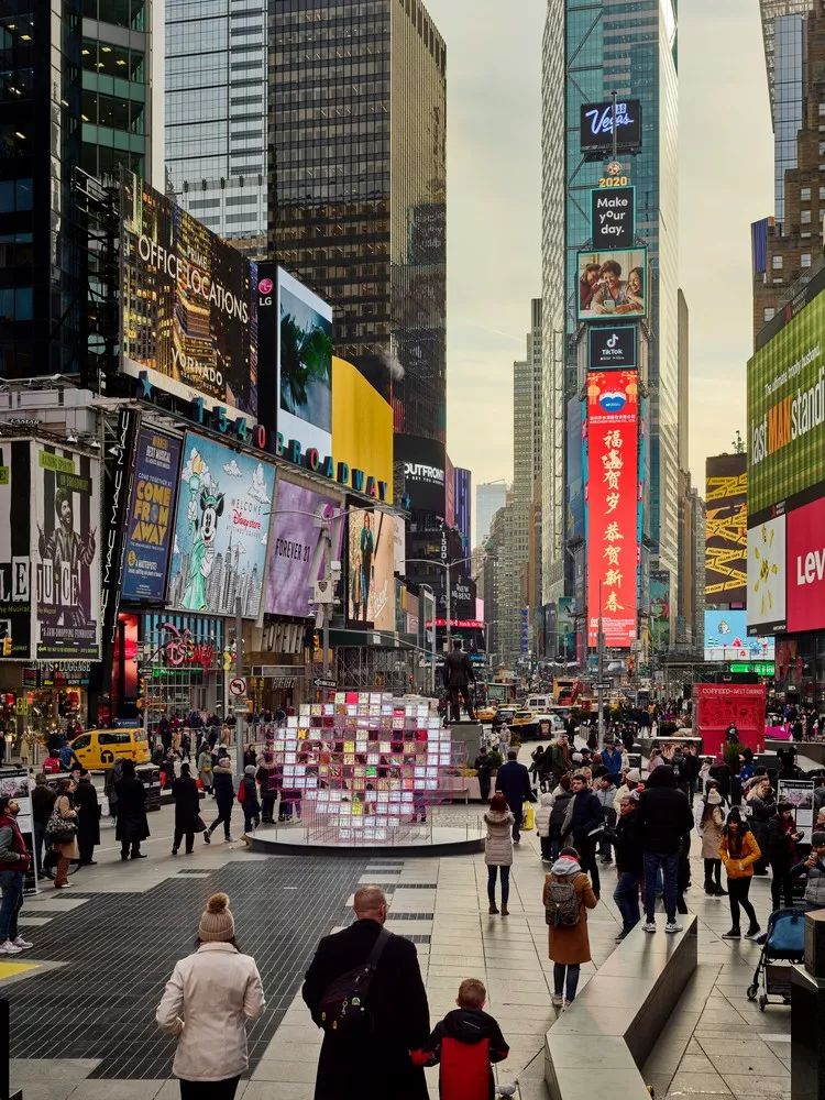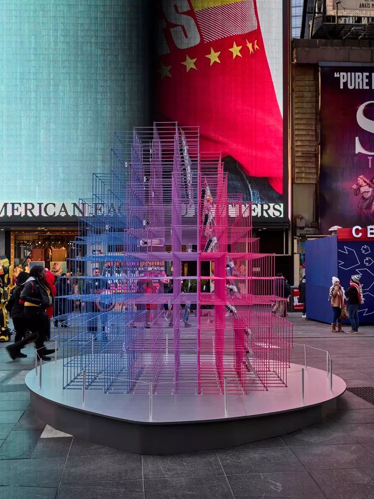 “Heart Squared”由125面鏡子組成,它們?cè)阡摽蚣苤幸圆煌较騼A斜,仿佛解剖心臟的輪廓,將時(shí)代廣場的景象轉(zhuǎn)變?yōu)槿宋铩⒔ㄖ锖蛷V告牌的萬花筒。正如團(tuán)隊(duì)所說,他們開發(fā)了一項(xiàng)專門的技術(shù)來計(jì)算特定的鏡面角度,將“有趣的驚喜”隱藏其中。當(dāng)觀眾圍繞著裝置移動(dòng)到特殊標(biāo)記的位置時(shí),這數(shù)百個(gè)鏡子的倒影突然融合在一起,展現(xiàn)出一個(gè)被鏡面天空包圍的像素化的城市生活中心。