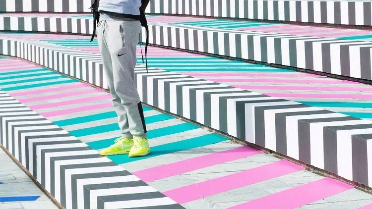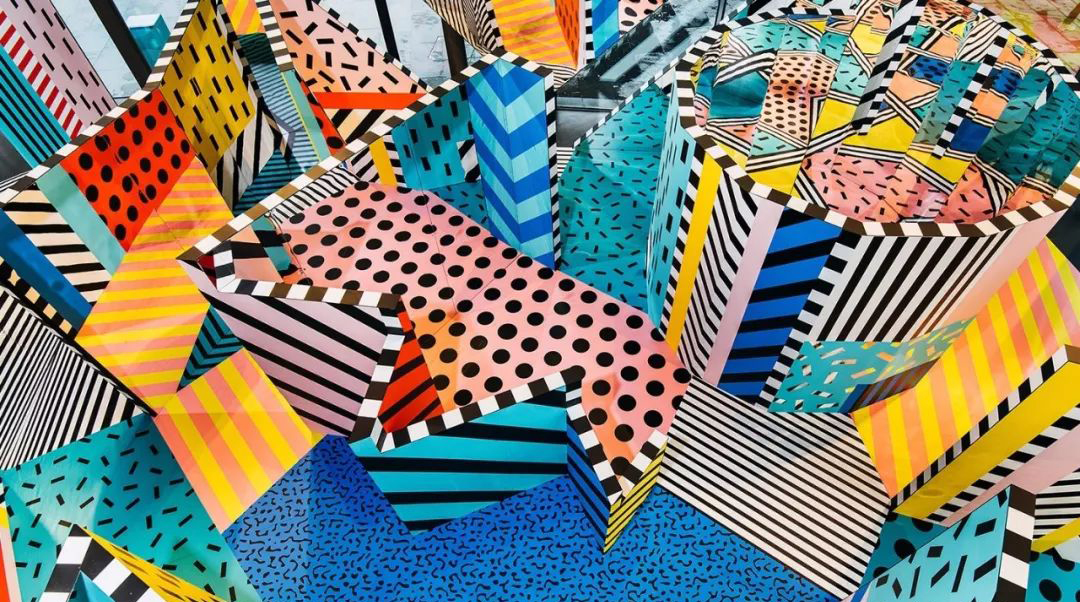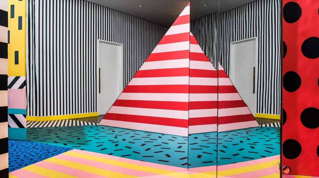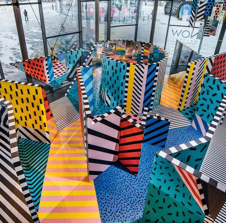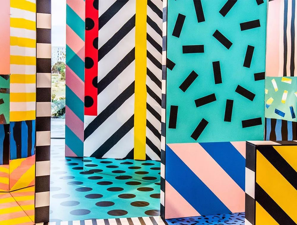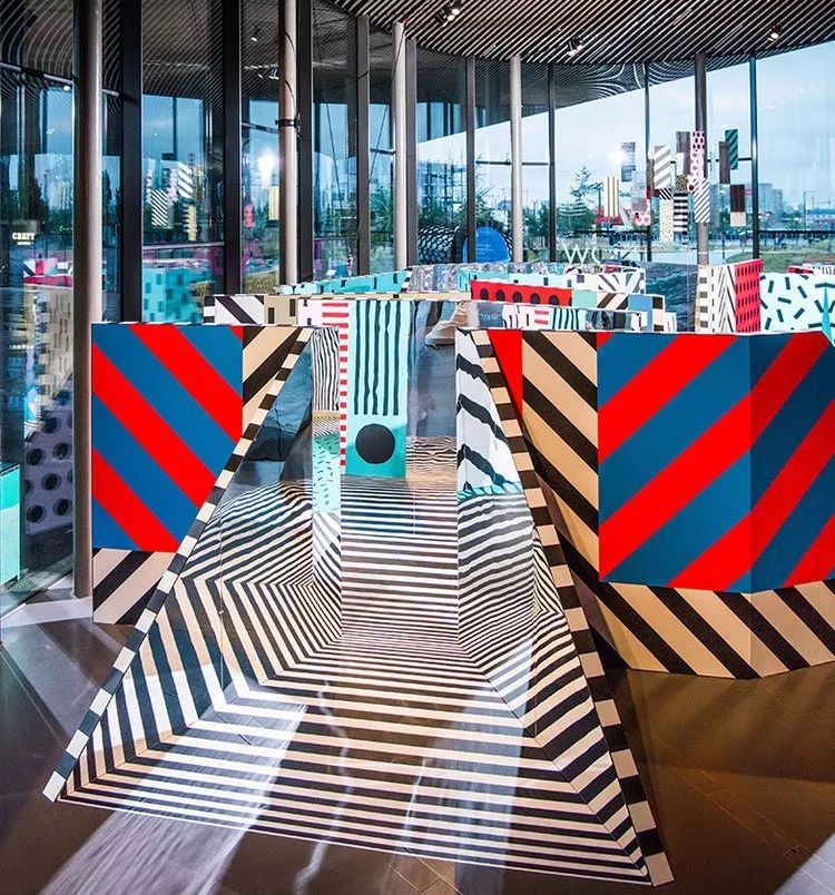 藝術(shù)家Camille Walala 以孟菲斯派的藝術(shù)風(fēng)格為靈感,在建筑物的表面涂上了色彩鮮明的幾何圖案,呈現(xiàn)出視覺錯視的效果。