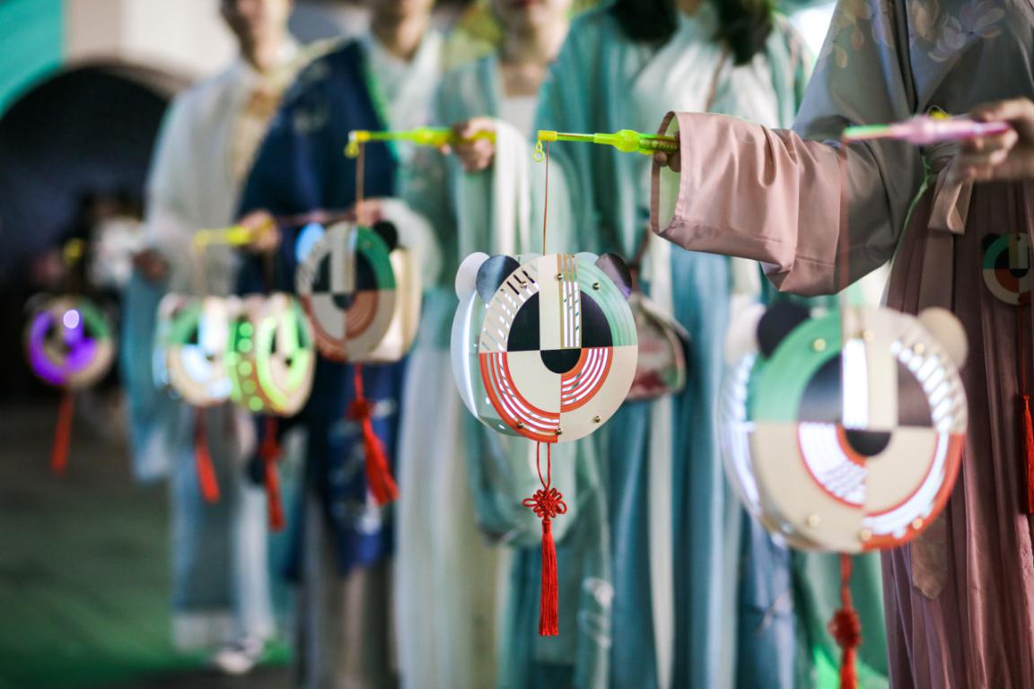 還沒進大門,就被門口仙氣的小哥哥小姐姐們吸引,他們身著漢服,頭戴珠花,手持木扇,微笑相迎,再配上整體快閃店建筑風格,一下子讓人有種穿越到古時的感覺。現(xiàn)場更有大量漢服愛好者聚集,姿態(tài)優(yōu)雅搖曳生姿,大量游客圍觀,大家紛紛舉起手機,一起合照打卡,記錄下這熱鬧景象。