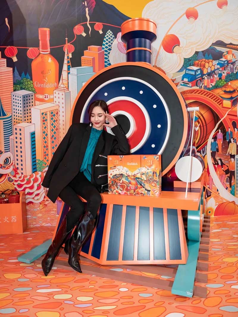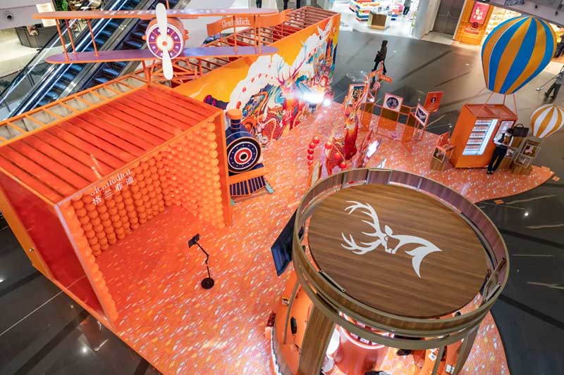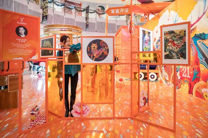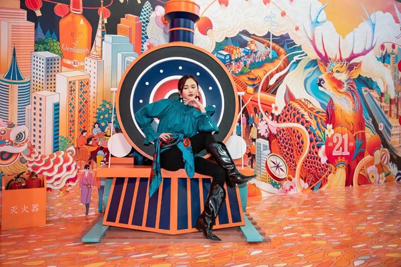 本次快閃店以格蘭菲迪與知名插畫師王榮亮(Rlon Wang)合作的2021新年特別版——福鹿呈祥21年臻藏版禮盒作為靈感來源,打造出一個復古奇幻的“福鹿之家”。活潑明艷的橙色調(diào)鋪滿整個空間,一頭七彩“福鹿”從遠方騰空而來,在帶有3D特效的蒸汽火車、老式飛機以及艷麗花朵元素的裝點下,仿佛闖入一個復古又旖麗的奇幻世界。一幅幅原創(chuàng)畫作在你眼前鋪開,東方的傳統(tǒng)視覺元素加上西方的形式表現(xiàn),具有很強的觀賞性和現(xiàn)代視覺表現(xiàn)力,能夠近距離感受王榮亮作品的鮮活魅力。在藝術家作品展示區(qū)的上方,還有一個站臺造型的指路牌,上面細心地表明了四大打卡區(qū)的方位,很是貼心。
